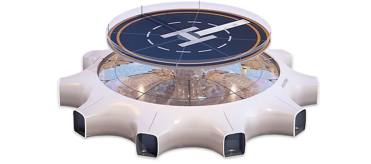 Hub(허브)는 지상 모빌리티인 PBV와 항공 모빌리티인 UAM이 만나는 거점이자 환승 센터입니다. Hub의 최상층에는 UAM 이착륙장이 위치하며, 1층에는 도심에서 운행한 PBV가 결합, 정차할 수 있는 도킹 스테이션이 마련되어 버스 터미널과 같은 역할을 수행합니다.