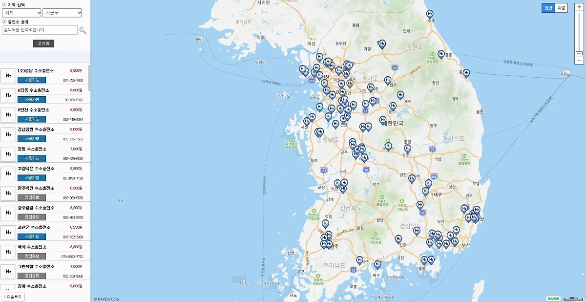 또한 무공해차 통합누리집 사이트의 수소충전소 정보 페이지에서는 충전소 주소, 운영시간, 전화번호 외에 수소 가격, 현재 영업 유무를 실시간으로 제공합니다. 사용 가능한 수소충전소는 파란색, 영업 종료된 수소충전소는 회색으로 표시됩니다.