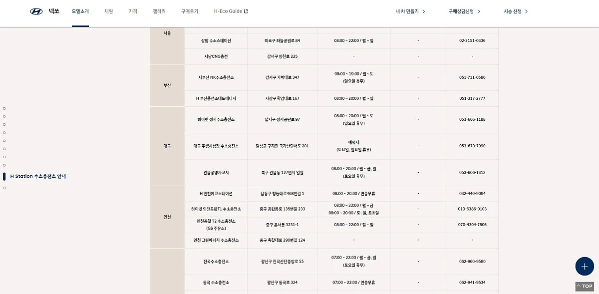 먼저 현대자동차는 수소전기차 넥쏘 구매 고객 편의를 위해 홈페이지에 수소 충전소 위치 및 운영시간 안내 페이지를 운영하고 있습니다.(바로가기) 주변 충전소 정보를 쉽게 확인할 수 있도록 지역별로 분류해 놓았고, 특히 장거리 주행 시 고속도로 휴게소 정보를 쉽게 확인할 수 있도록 고속도로에 위치한 충전소 정보를 별도로 분류했습니다. 또한 충전소 운영 시간과 함께 충전소 연락처 정보를 확인할 수 있어 방문 전 정확한 정보 확인이 가능합니다.