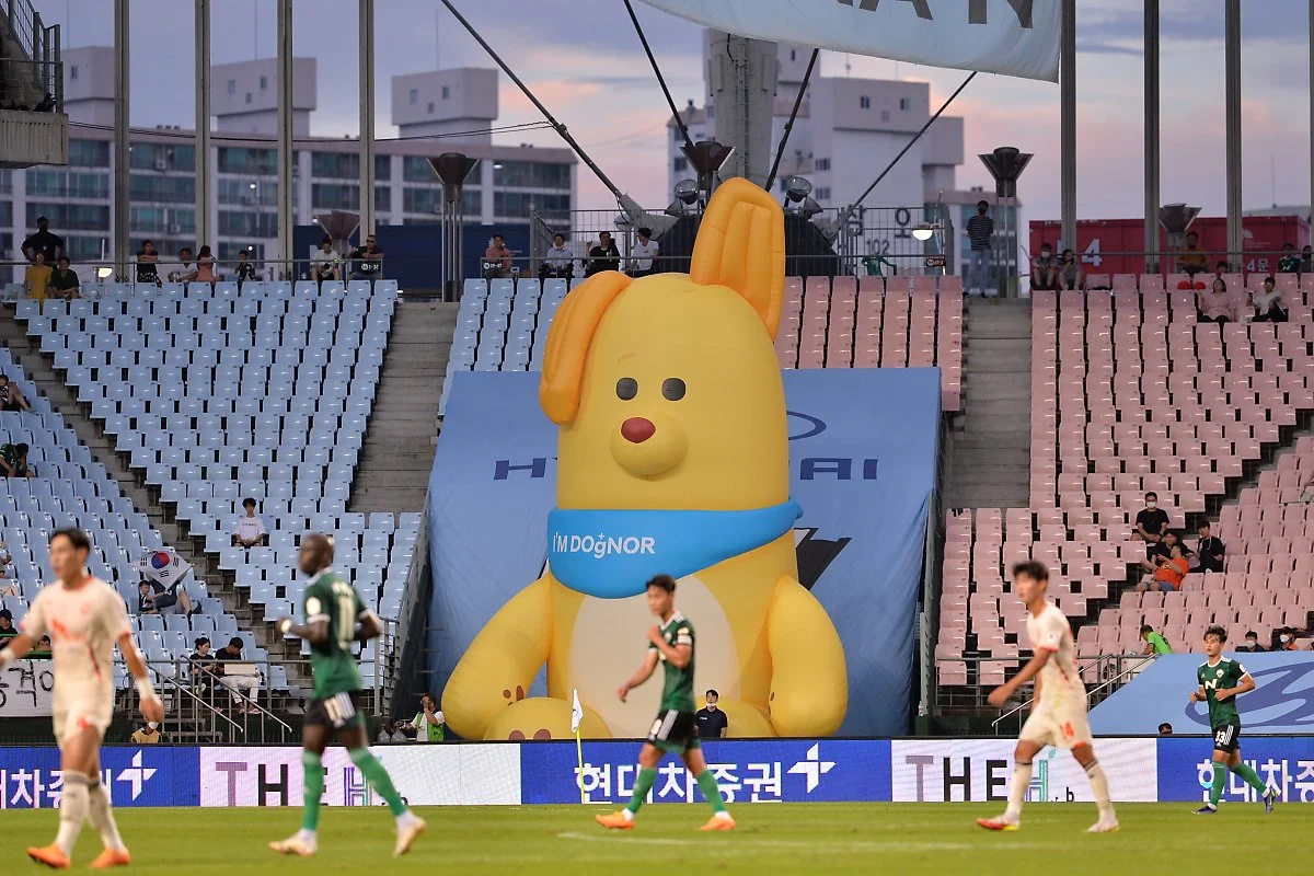 이날 경기장에는 ‘아임 도그너’의 심벌 캐릭터 ‘덕구(DOgKU)’의 10m 높이 공기조형물도 함께 등장해 관중들의 시선을 사로잡았습니다. ‘덕구’는 실제 천안의 한 도살장에서 구출된 ‘설악이’라는 이름의 건국대학교 소속 헌혈견을 모티브로 탄생했습니다.