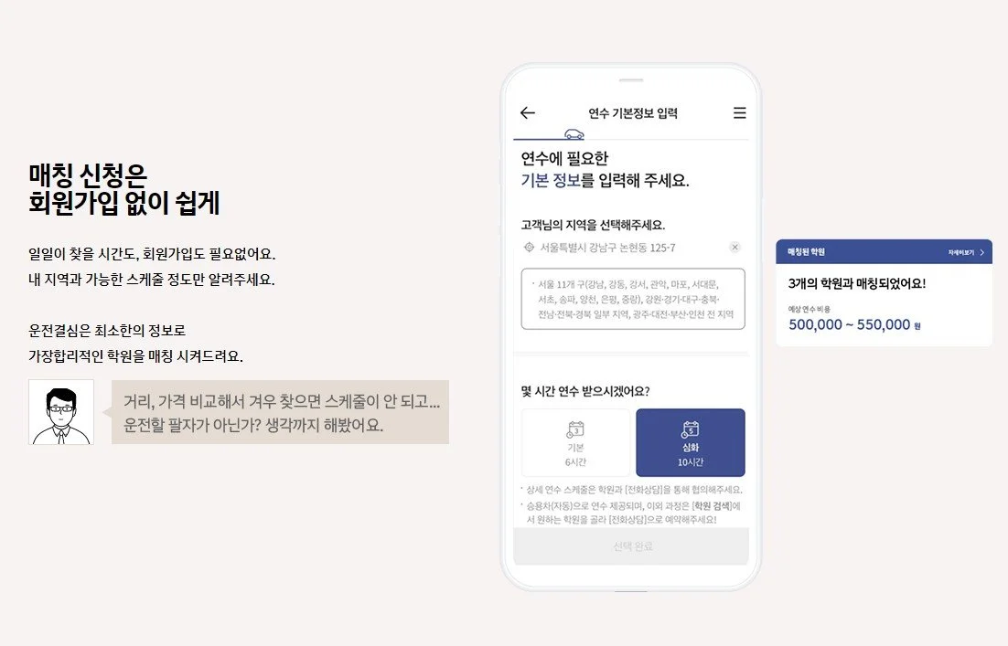 일일이 찾을 시간이 없는 분들이라면 매칭 신청을 활용하는 것을 추천합니다. 매칭 신청은 회원가입 없이 내 지역과 가능한 스케줄 정보와 같이 최소한의 정보를 기입하는 것만으로 충분합니다. 기입한 정보를 기반으로 가장 합리적인 학원을 매칭해주며, 예상 연수 비용까지 미리 확인할 수 있습니다.