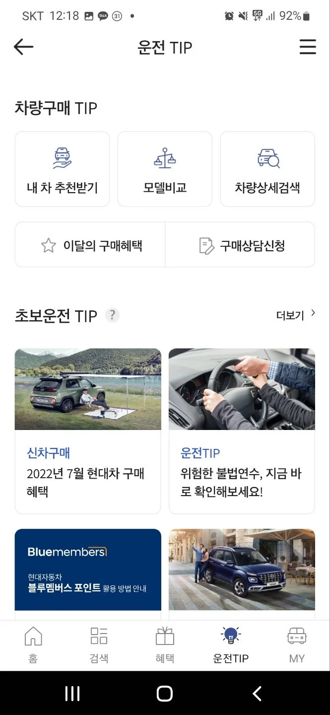 운전결심 앱에는 운전연수학원 매칭 외에 초보운전자를 위한 ‘운전 TIP’ 페이지가 있습니다. 운전 TIP에는 교통법규, 사고처리 등 초보운전자들에게 필수로 필요한 정보들과 함께 자동차 구매를 위한 다양한 정보를 확인할 수 있습니다. 차량을 구입하고자 하는 운전자를 위한 ‘내 차 추천받기’와 차량 선택에 도움을 주는 ‘모델비교’, ‘할부계산기’ 기능까지 제공됩니다.