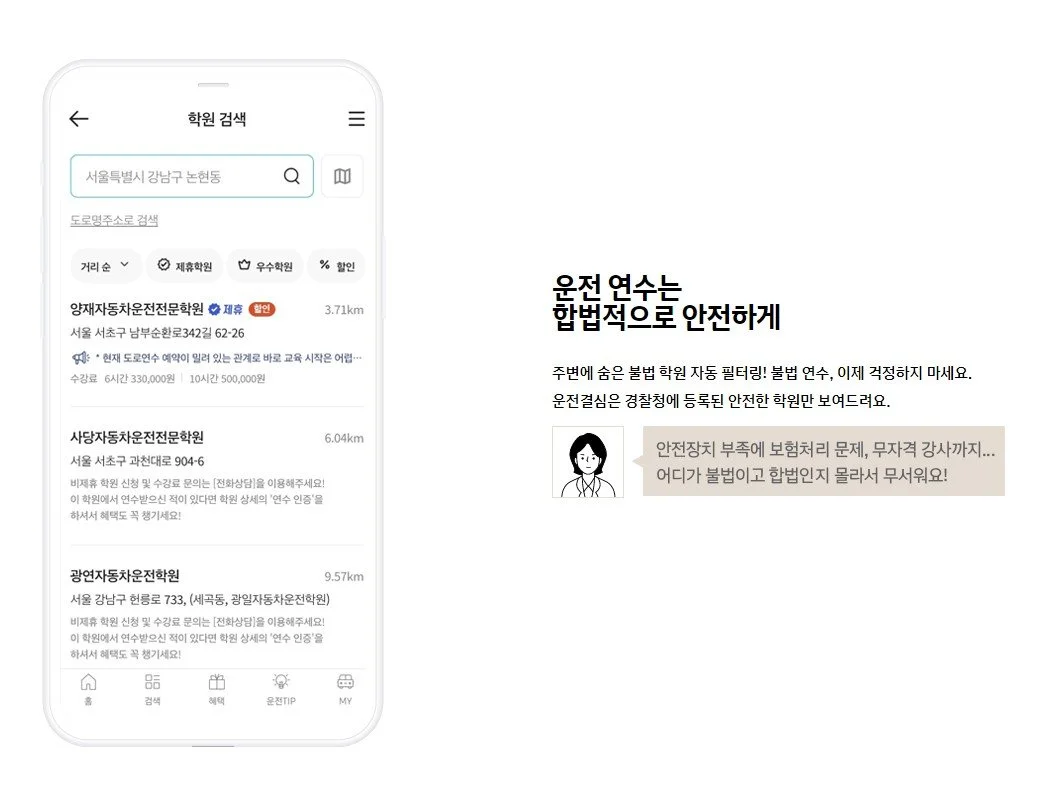 새롭게 운전면허를 땄거나, 장롱면허를 탈출하기 위해 운전 연수를 받고자 하는 사람들이 많습니다. 하지만 금전 사기, 미검증 강사의 강습, 불법 개조 교습 차량 등 불법 운전 연수와 같은 불법 운전 연수 업체가 많습니다. 그럼에도 고객 인식 부족, 합법 운전연수의 복잡한 절차 및 낮은 접근성 등의 이유로 불법 운전 연수는 계속해서 성행해 왔습니다.