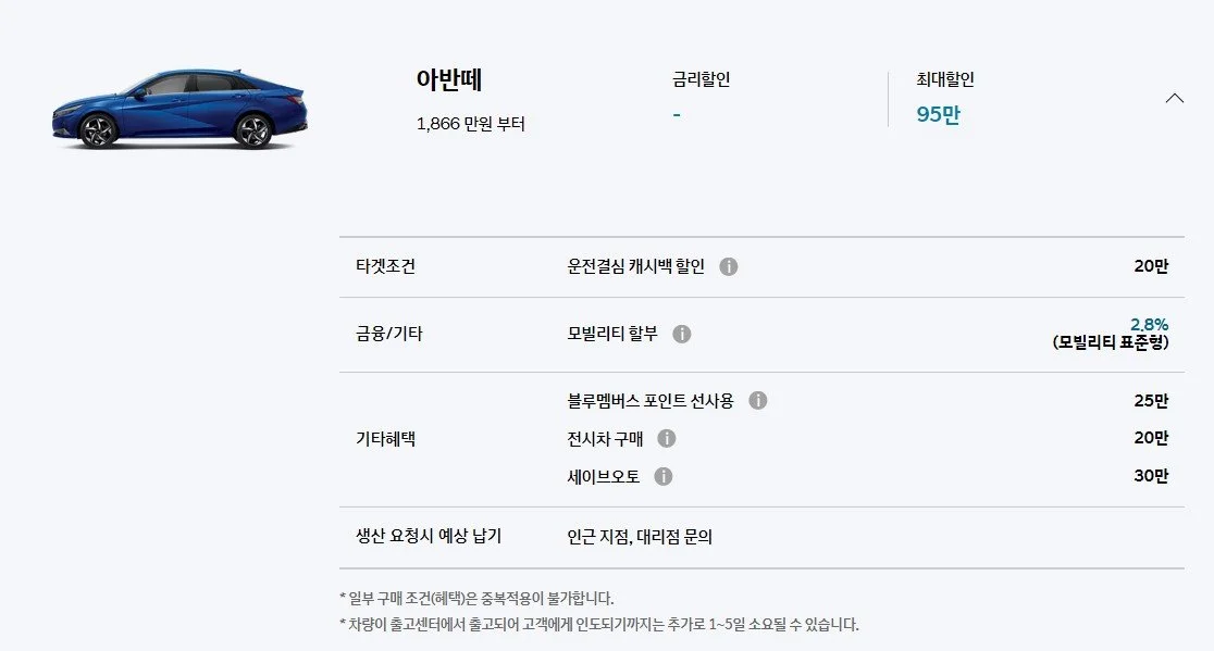 또한 현대자동차는 운전결심 프로그램을 이용해 운전 연수를 완료한 고객에게 특별 프로모션을 제공합니다. 만약 운전결심 연수 후 기한 내 현대 모빌리티 카드로 현대자동차 모델을 출고할 경우 20만 원을 캐시백 해주는 ‘운전결심 캐시백 할인’ 프로모션을 진행하고 있습니다. 운전결심 캐시백 할인이 제공되는 차량은 아반떼(하이브리드, N, N Line 포함), 베뉴, 코나(하이브리드, N, N Line 포함)입니다.