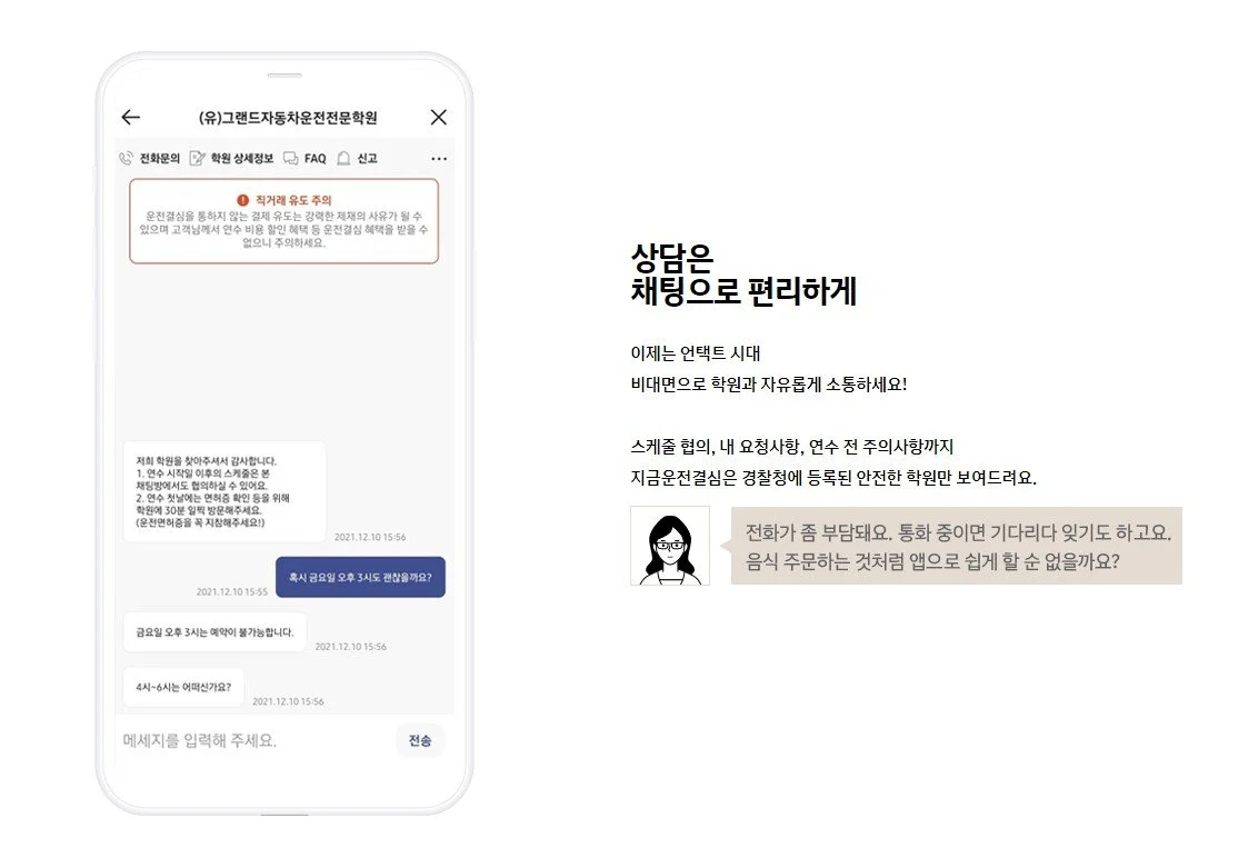 매칭 신청을 통해 학원을 선택하면, 상담이 진행됩니다. 상담은 언택트 시대에 맞춰 비대면 상담으로 진행됩니다. 또한 전화가 부담스러운 고객을 위해 채팅으로 부담 없이 진행됩니다. 채팅을 통해 연수 스케줄 협의, 연수 시 주의사항, 내 요청사항 등 연수 전 사전에 필요한 모든 정보를 확인하고, 상담받을 수 있습니다.