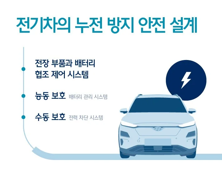 또한 혹시 모를 누전에 대비하기 위한 안전 설계도 적용됩니다. 만약 방수 설계 손상 등으로 인해 배터리 내부로 물이 유입되면, 수분 센서가 이를 감지해 자동으로 전원을 차단합니다. 이처럼 전기차는 침수 상황에 다중 안전장치를 마련해 침수 안전성을 확보했습니다.