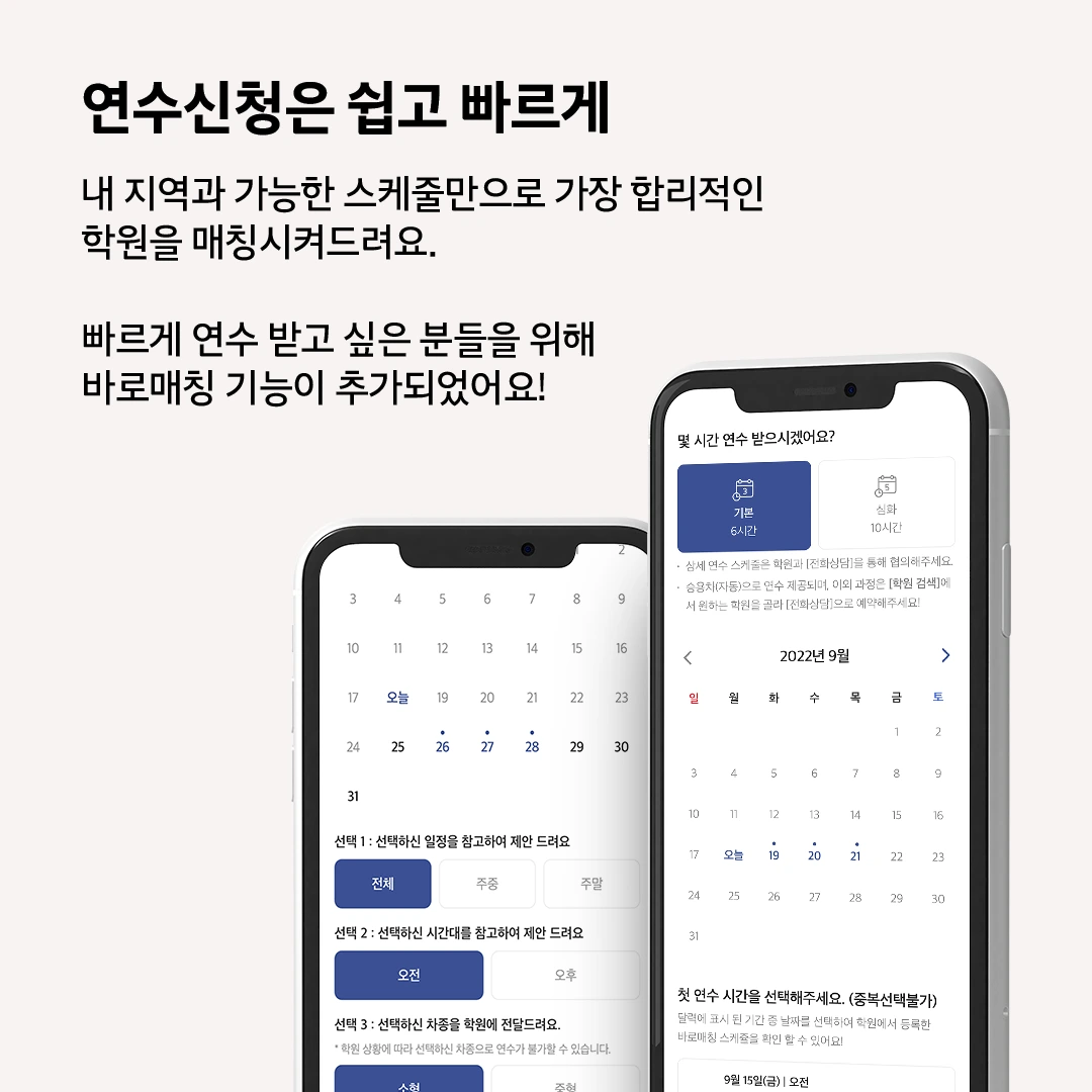 학원 일정에 따라 2~3주 뒤부터 연수 신청이 가능했던 일반 매칭 프로세스를 보완하기위해 ‘바로 매칭’ 기능을 신설하여, 학원 일정의 3일 내 공백 발생 시 빠르게 연수를 신청할 수 있도록 개선했습니다. 새롭게 추가된 ‘운전고수 Q&A’는 고객이 차량 운행 및 기능, 관리법, 구매 등 차량과 관련된 질문을 올리면 운전 전문가인 ‘현대 드라이빙 익스피리언스’의 인스트럭터들이 직접 답변드립니다.