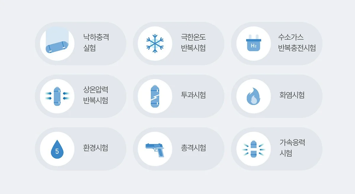 안전성 확보를 위한 다양한 안전 시험도 진행합니다. 내연기관 자동차와 동일한 조건의 충돌 테스트와 함께 수소연료 탱크 낙하 충격 실험, 화염 시험, 내한성 시험 총격 시험, 부식도 확인을 위한 환경시험 등 다양한 실험에도 문제가 발생하지 않았습니다.