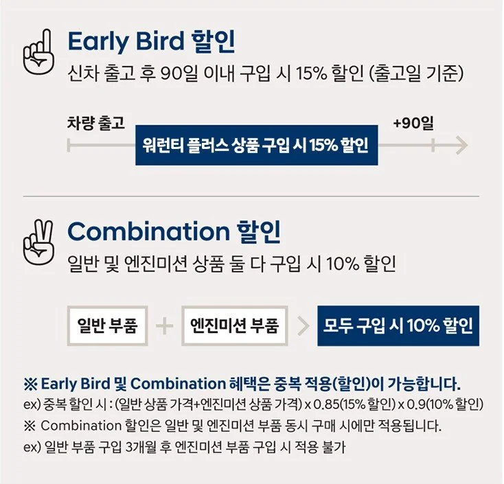 워런티 플러스는 프로모션 혜택을 활용하면 더욱 합리적인 가격에 구입이 가능합니다. 먼저 얼리버드(Early Bird) 할인은 신차 출고 후 90일 이내에 워런티 플러스를 구입 고객에게 상품 가격의 15%를 할인해 주는 프로모션입니다. 두 번째는 콤비네이션(Combination) 할인입니다. 일반 부품과 엔진미션 부품 모두 구매하는 고객에게 주는 혜택으로 두 상품의 합산 가격의 10%를 할인해 줍니다. 또한 얼리버드 할인과 콤비네이션 할인은 중복 할인도 가능합니다.