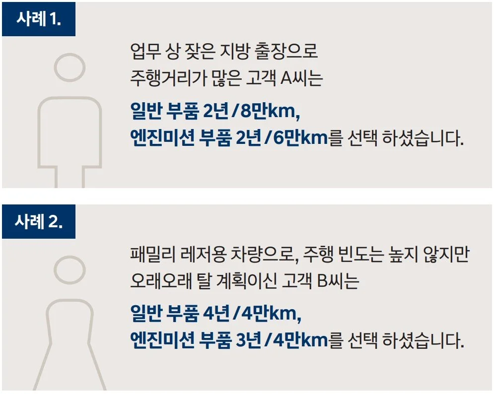만약 주행거리가 짧은 운전자라면 일반부품 4년/4만km, 엔진미션 부품 3년/4만km를 선택하는 것을 추천합니다. 반대로 주행거리가 긴 운전자라면 일반부품 2년/8만km, 엔진미션 부품 2년/6만km를 선택하는 등 운전자의 라이프 스타일에 맞춰 합리적으로 구입하는 것이 좋습니다.