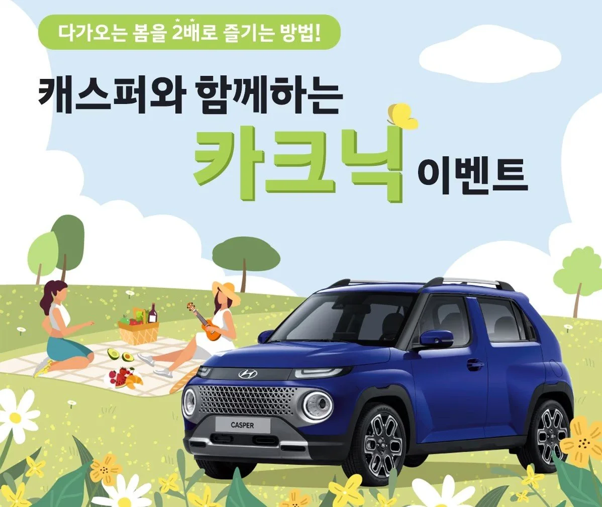 또한 현대자동차는 3월 다가오는 봄을 맞이해 캐스퍼와 함께하는 카크닉 이벤트를 진행합니다. 먼저 3월 캐스퍼 특별 기획전 차량 구매 시 최대 100만 원을 할인 혜택을 제공합니다. 또한 3월 중 캐스퍼를 계약하고, 응모한 고객 중 추첨을 국민관광상품권 150만 원(1명), 노르디스크 4인용 캠핑 텐트(5명), BOSE 블루투스 스피커(50명) 등 다양한 이벤트를 진행합니다. 견적만 내도 이벤트 참여가 가능합니다. 3월 중 캐스퍼 견적 후 저장, 이벤트 응모한 고객분 중 200명을 추첨해 캠핑, 피크닉용 폴딩박스를 선물해 드립니다.