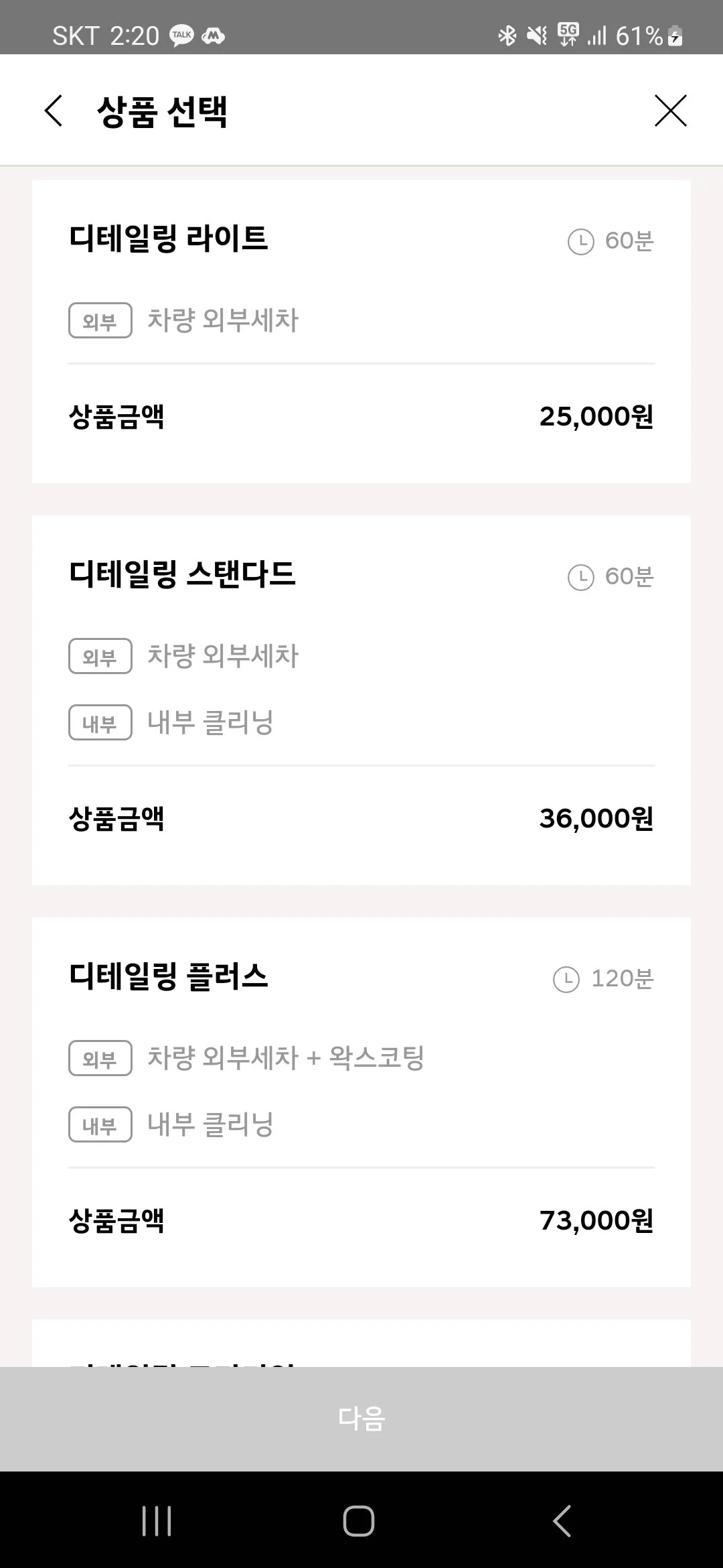 가격은 차량마다 상이하며, 외부 세차는 25,000원부터 시작, 내/외부 세차는 36,000원부터 시작합니다. 또한 왁스 코팅이 추가된 디테일링 플러스, 유막 제거 및 발수코팅까지 제공하는 디테일링 프리미엄 서비스도 선택할 수 있습니다. 또한 필요에 따라 픽업, 딜리버리 옵션을 선택하면 직접 방문하지 않고 세차 서비스를 이용할 수 있습니다. (손세차 서비스 바로가기)