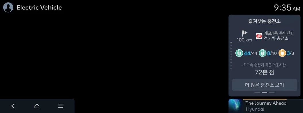 디 올 뉴 코나의 충전소 정보 위젯은 다양한 상황에 맞춰 충전소 정보를 확인할 수 있는 위젯입니다. 내비게이션 상 목적지 주변 충전소, 가까운 충전소, 즐겨 찾는 충전소 등 상황에 맞는 충전소 정보를 위젯으로 띄워 쉽게 확인할 수 있습니다.