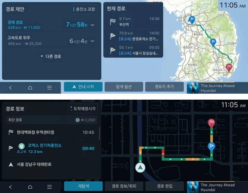 디 올 뉴 코나의 EV 경로 플래너는 배터리 잔량과 목적지까지의 이동거리를 분석해 추언이 필요한 경우 경로 상의 최적의 충전소를 찾아내 경유지로 안내해 주는 기능입니다. EV 경로 플래너는 장거리 주행 시 충전 걱정과 충전소를 찾기 위한 불필요한 이동을 줄여주는 꼭 필요한 기능입니다.