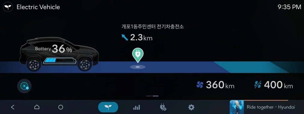 디 올 뉴 코나 일렉트릭의 신규 EV 전용 모드는 인포테인먼트 디스플레이를 통해 EV 관련 정보와 기능을 한곳에서 쉽게 확인하고, 조작할 수 있도록 구성됐습니다. 기본적으로 차량의 배터리 잔량, 근처 충전소, 공조기 작동 여부에 따른 주행 가능 거리를 확인할 수 있습니다. 특히 스마트폰과 유사한 위젯 방식으로 화면을 운전자의 취향에 맞춰 구성할 수 있어 편의성이 뛰어납니다.