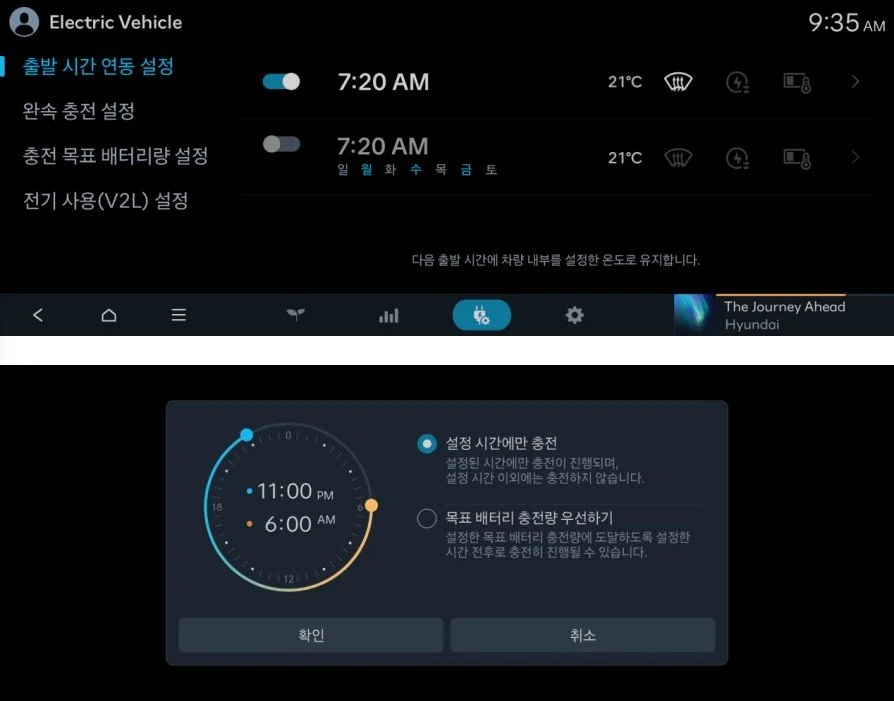 전기차 운전자들이 자주 사용하는 예약 충전/공조 로직 개선도 이뤄졌습니다. 기존에는 다음 출발 시간을 설정하기 전까지는 예약 공조/ 충전이 불가능하고, 상호 간의 연동 로직 이해가 어려웠습니다. 하지만 이제는 출발 시간 연동 설정은 예약 공조, 배터리 컨디셔닝 상태와 연동됐고, 기존에는 충전기 연결 시에만 실행할 수 있었던 예약 공조는 충전기 연결 없이도 작동하도록 개선됐습니다.