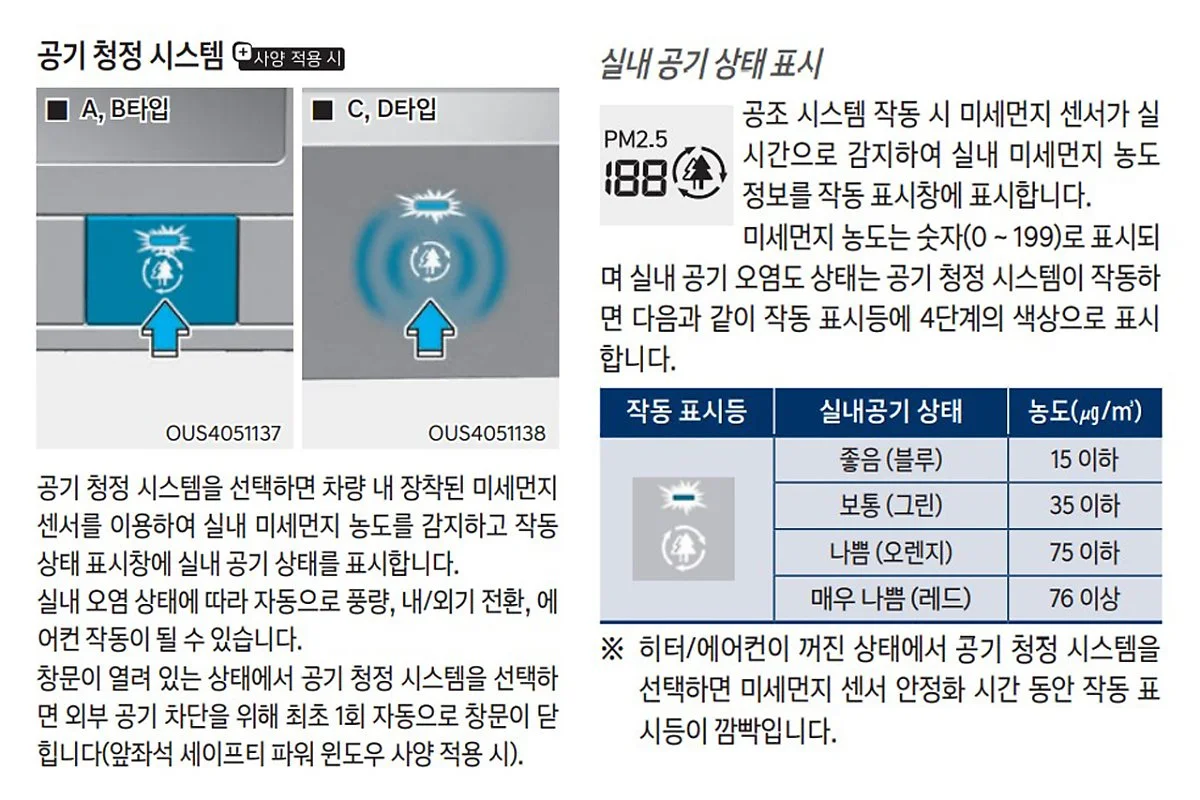 공기청정 시스템은 차량마다 세부적인 기능에 차이는 있지만, 일반적으로 차량 내 장착된 미세먼지 센서를 통해 농도를 감지, 공조기 화면에 차량 내 공기질을 표시해 줍니다. 공기 상태에 따라 좋음(블루, 15㎍/m³ 이하), 보통(그린, 35㎍/m³ 이하), 나쁨(오렌지, 75㎍/m³ 이하), 매우 나쁨(레드, 76㎍/m³ 이상)으로 4단계로 표시되며, 공기 청정 모드가 작동해 실내 공기질을 개선해 주는 방식입니다.