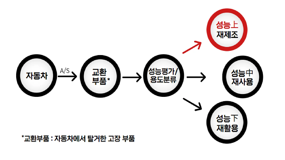 재제조 부품이란 교환 부품을 회수하여 분해-세척-입고-검사-수리-조립-출고 검사의 과정을 거쳐 신품과 동등한 성능을 갖춘 상태로 다시 제조한 부품입니다. 교환 부품의 성능에 따라 재제조·재사용·재활용 여부가 결정되는데, 성능이 높을수록 일부만 교체·수리하여 재제조부품을 만들 수 있습니다.