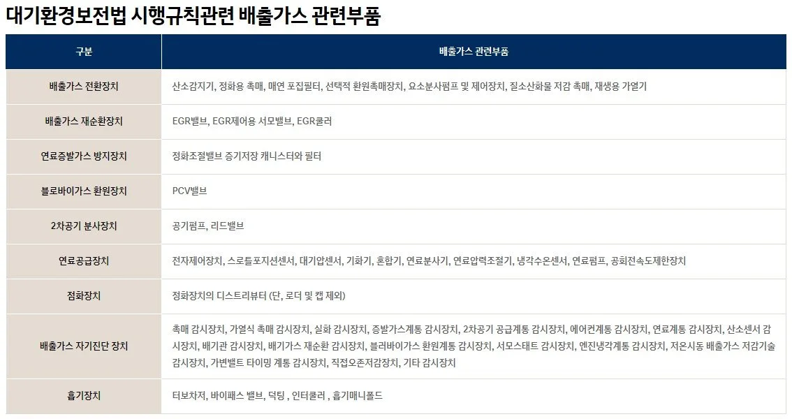 대기환경보전법 시행규칙 관련해 배출가스 관련 부품은 승용/SUV 모델 모두 2012년 1월 이후 모델 기준 촉매, 전자제어장치는 7년/12만km을 보증합니다. 여기에 기타 배출가스 부품은 5년/8만km의 보증기간을 제공합니다.
