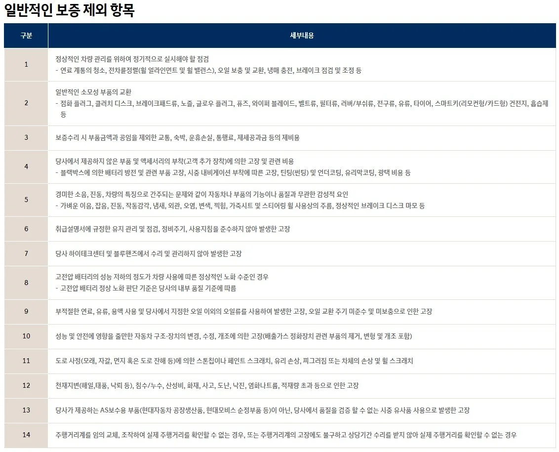 보증기간 내에 발생한 문제라도 취급 설명서에 규정한 유지 관리 및 점검, 정비주기, 사용지침을 준수하지 않아 발생한 고장에는 보증이 제외됩니다. 또한 오일 보충 및 교환, 냉매 충전, 브레이크 점검 등의 일반적인 차량 점검 항목도 보증 항목에서 제외됩니다. 녹/부식 관련해서도 사고 및 차량 외관의 변경, 개조 등으로 인해 발생한 녹/부식은 사용자 과실로 보증 제외 항목에 속합니다.