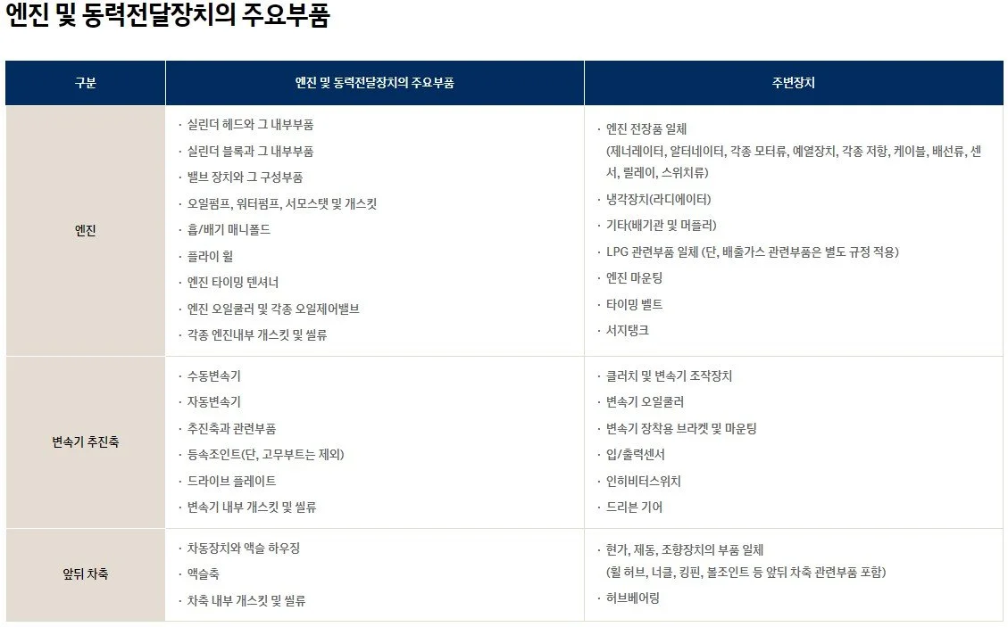 엔진 및 동력전달장치의 주요 부품은 엔진, 변속기 추진축, 앞뒤 차축의 주요 동력 전달 부품에 해당합니다. 엔진의 실린더 헤드와 블록, 그 내부부품, 오일펌프, 워터펌프, 서모스탯 및 개스킷 등이 해당하며, 변속기의 추진축과 관련된 부품도 이에 해당됩니다. 엔진, 변속기, 앞뒤 차축에 속한 부품 중 주변 장치에 속하는 부품은 차체 및 일반 부품의 보증기간과 동일하게 적용됩니다.