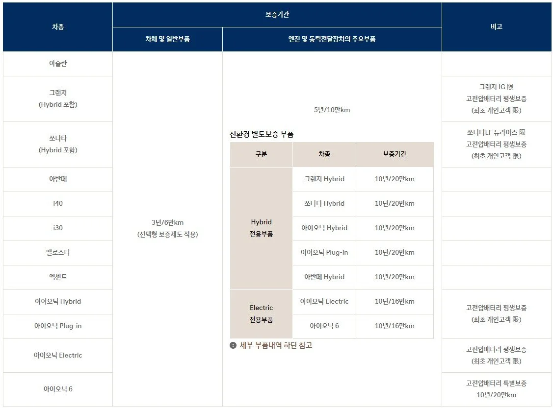 현대자동차 친환경자동차 모델 중 초기형 모델인 그랜저 IG 하이브리드, LF 쏘나타 하이브리드, 아이오닉 하이브리드(플러그인 포함), 1세대 코나 일렉트릭은 최초 고객 한정 고전압배터리 평생 보증을 제공합니다. 특히 코나 일렉트릭의 경우 최초 개인고객 외 10년/20만km를 제공합니다. 여기에 2020년형 코나 일렉트릭과 아이오닉 5, 아이오닉 6는 10년/20만km의 고전압배터리 특별 보증을 제공합니다.
