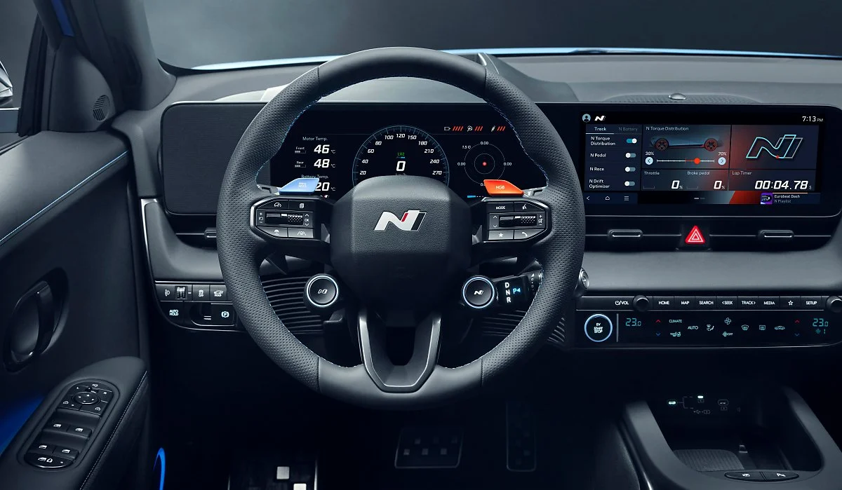 주행성능을 극대화할 수 있도록 새롭게 디자인된 N 전용 스티어링 휠은 혼 커버에 N 브랜드 로고가 적용됐으며 운전자가 원하는 대로 주행 모드를 각각 설정할 수 있는 2개의 N 버튼이 탑재됐습니다. 또한, N e-쉬프트, N 페달 기능에 활용되는 패들 쉬프터와 최대 10초 동안 출력을 증가시키는 NGB 버튼이 배치돼 조작 편의성을 높였습니다.
