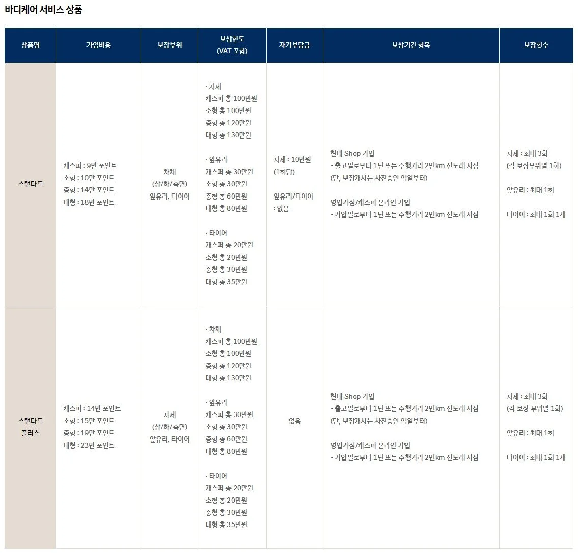 현대자동차 바디케어 서비스는 차량 구입 후에도 새 차의 모습을 그대로 유지하고자 하는 고객분들의 마음을 담아 신차 출고일부터 최대 1년(또는 주행거리 2만km) 동안 단독사고 발생 시 차량의 외장 손상에 대한 판금, 도장, 교체 등을 보장해 드리는 서비스 상품입니다.