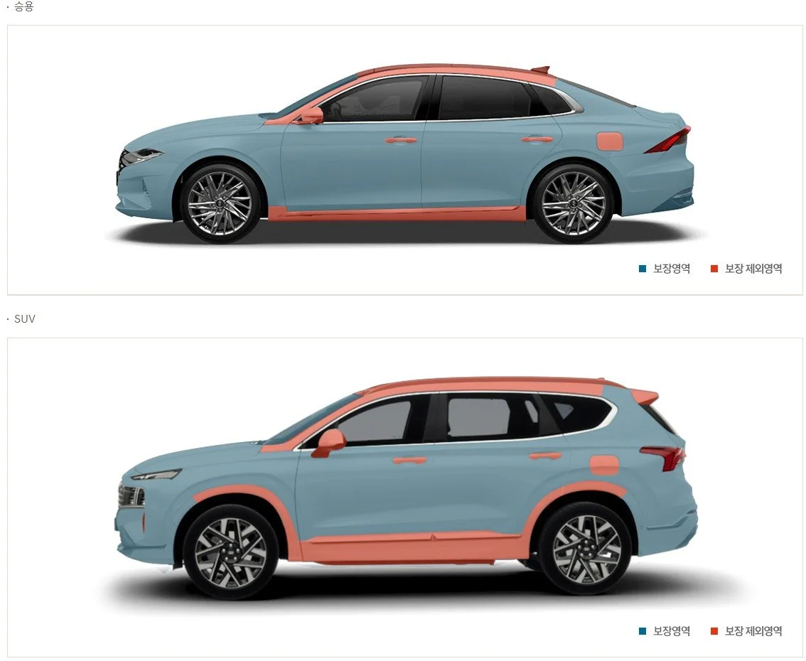 보장내역은 차량 후드, 트렁크 리드, 휀더, 도어, 유리, 타이어 등 전반적인 차량의 외관 대부분이 포함됩니다. 다만, 도어 핸들, 주유구 커버, 사이드미러 커버, 사이드 스커트 등 일부 영역은 보장 영역에서 제외됩니다.