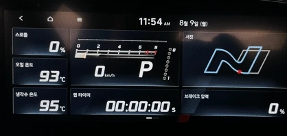 여기에 더불어 차량의 랩 타입은 물론이고 현재 사용하는 브레이크 압력과 스로틀까지 정확하게 수치화된 것을 볼 수 있습니다. 현대 N 앱과 연동하면 자신의 주행 데이터를 저장해서 볼 수 있고 분석까지 되기 때문에 스포츠 드라이빙에 유용하게 쓰입니다.