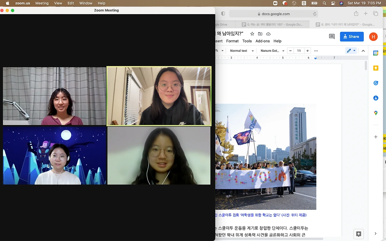 [사진] 평등문화위원회 화상회의 화면. 왼쪽 위부터 시계방향으로 하영, 경하, 도현,아고 [사진 끝]