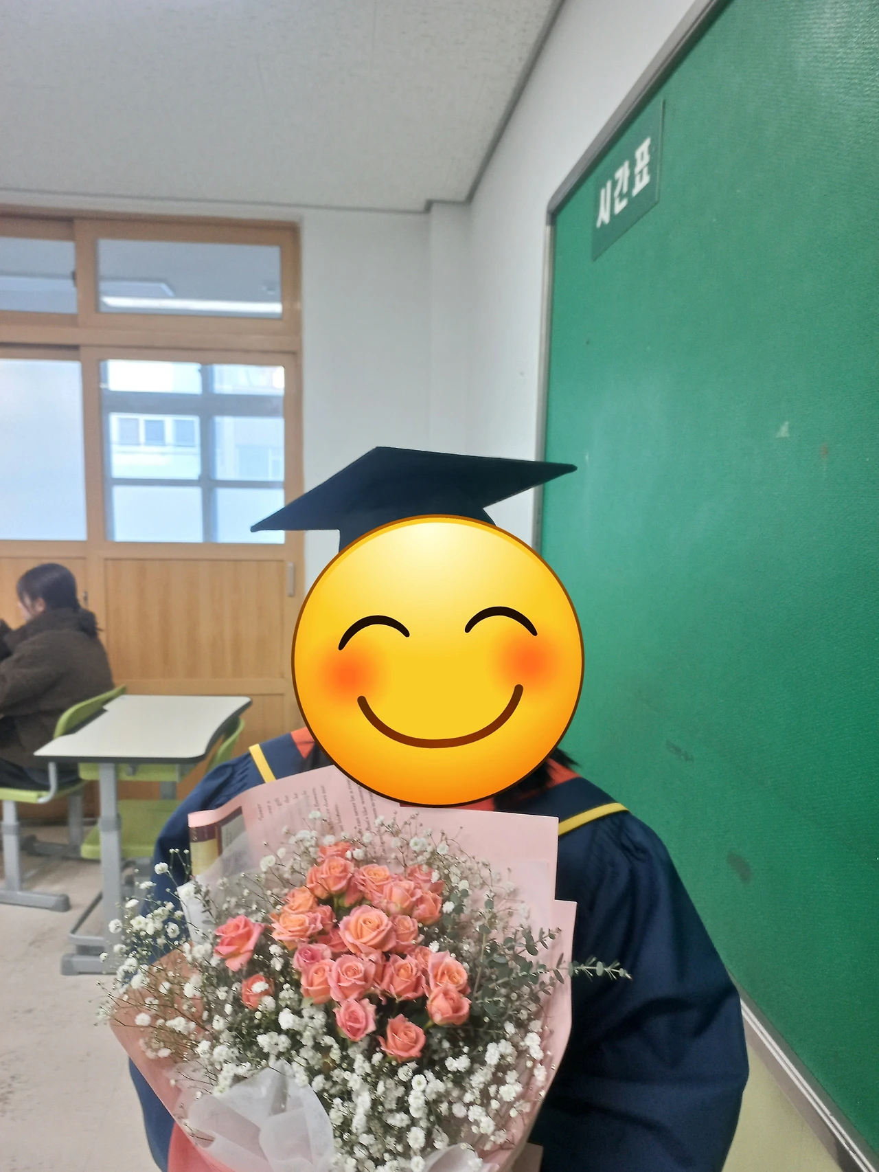 졸업가운을 입고 친구들과 함께 사진을 찍고 담임선생님께 실장과 내가 선물과 편지, 꽃다발을 전달했다. 그리고 우리는 졸업식을 위해 강당으로 향했다.