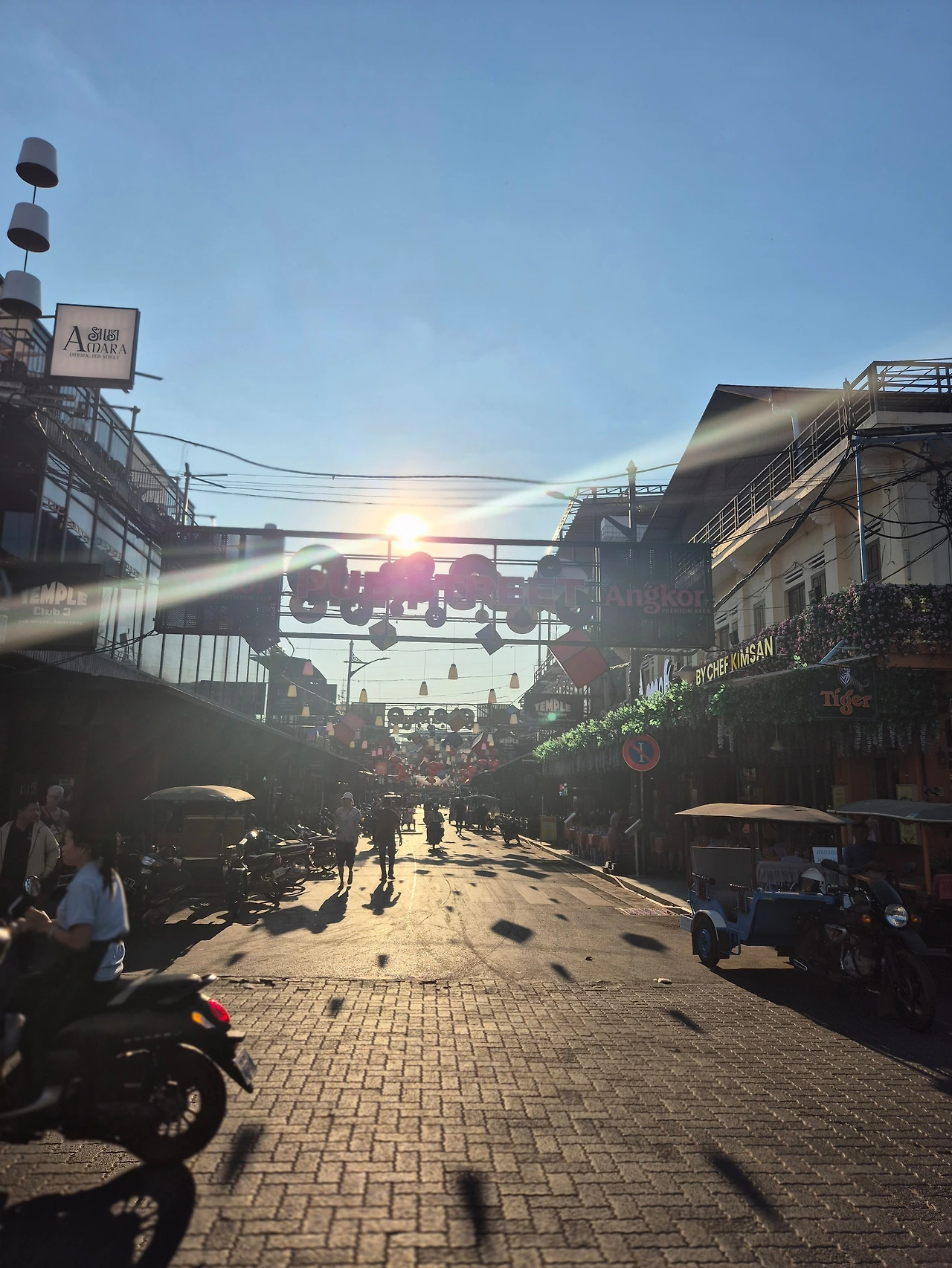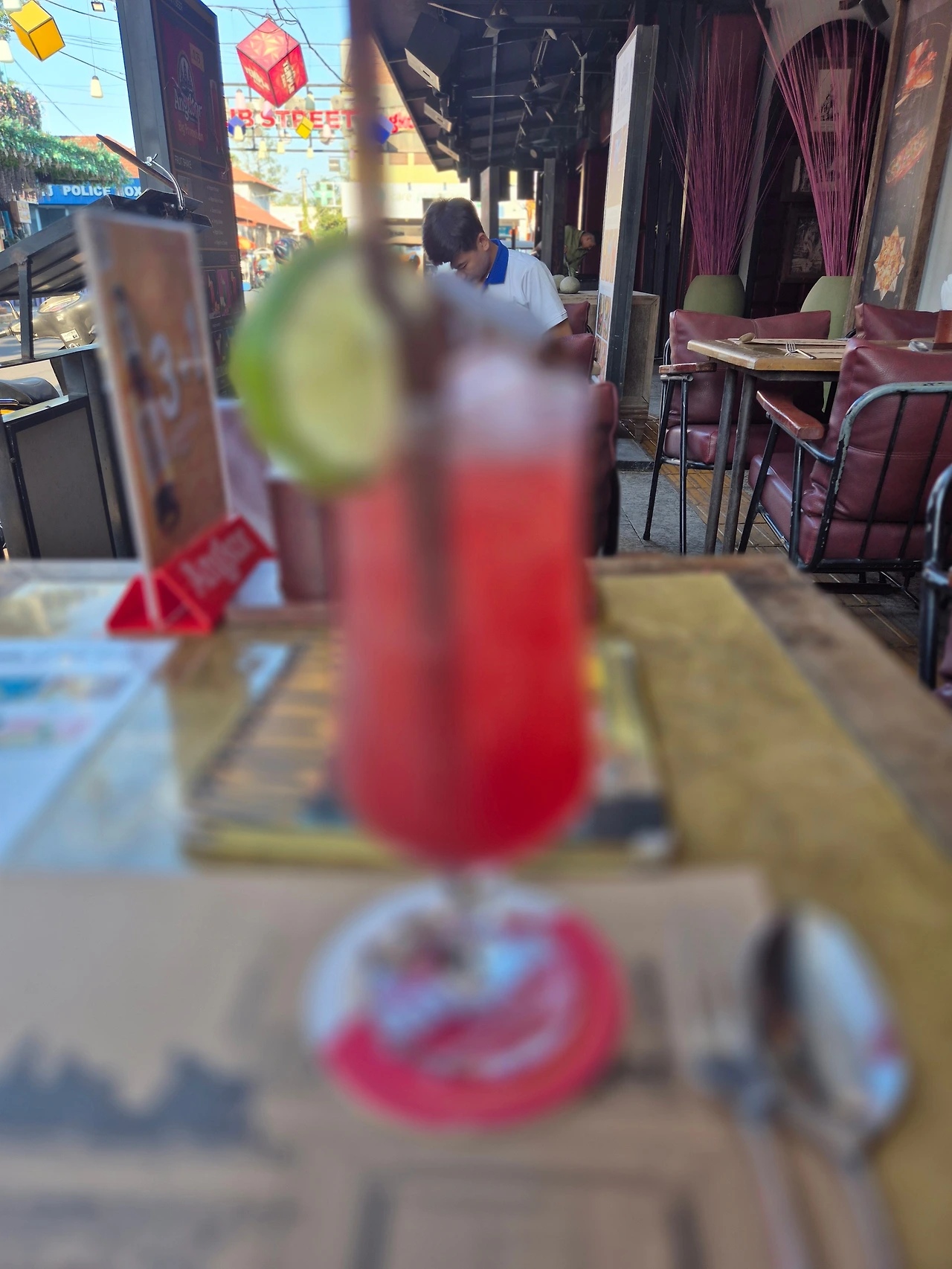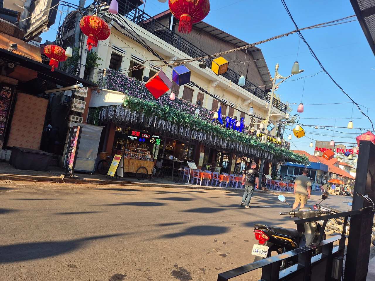 앉아 있거나 누워만 있었는데도 배가 고파져 저녁을 먹으러 가기로 했다. 오늘은 "펍 스트리트"를 가보기로 마음먹고 숙소 앞의 툭툭이를 잡아 탔다. 펍들이 양 옆으로 즐비하게 늘어서 있어 어디로 가야 할지 혼란스러웠다. 그래서 입구 근처의 가게로 들어가 칵테일과 튀김 아이스크림을 시켰다. 캄보디아 수프에 모차렐라치즈를 얹은 메뉴 한 개와 앙코르 맥주 두 잔을 더 시켜 먹었다.