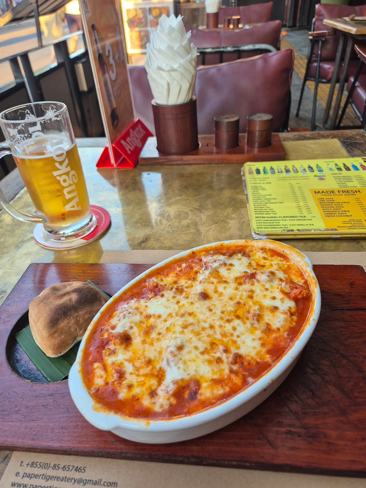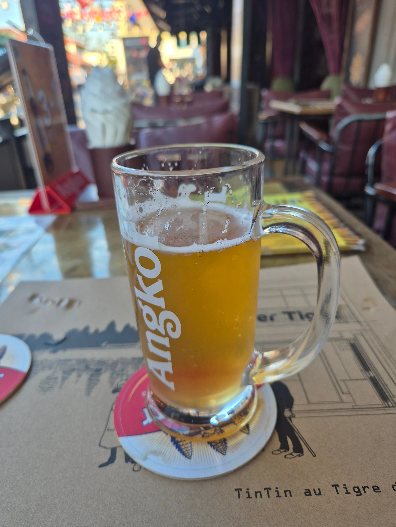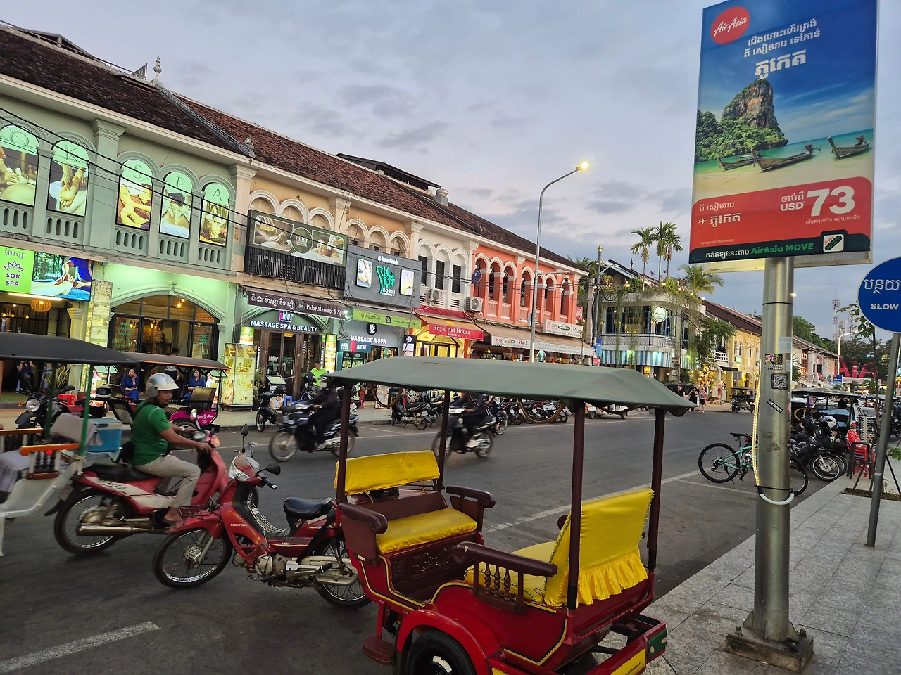 앉아 있거나 누워만 있었는데도 배가 고파져 저녁을 먹으러 가기로 했다. 오늘은 "펍 스트리트"를 가보기로 마음먹고 숙소 앞의 툭툭이를 잡아 탔다. 펍들이 양 옆으로 즐비하게 늘어서 있어 어디로 가야 할지 혼란스러웠다. 그래서 입구 근처의 가게로 들어가 칵테일과 튀김 아이스크림을 시켰다. 캄보디아 수프에 모차렐라치즈를 얹은 메뉴 한 개와 앙코르 맥주 두 잔을 더 시켜 먹었다.