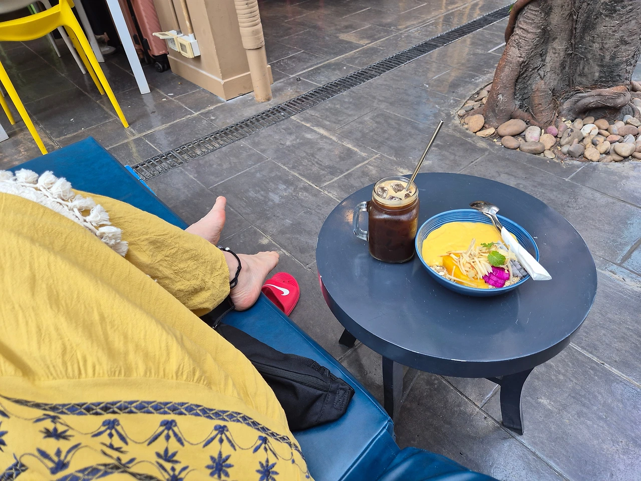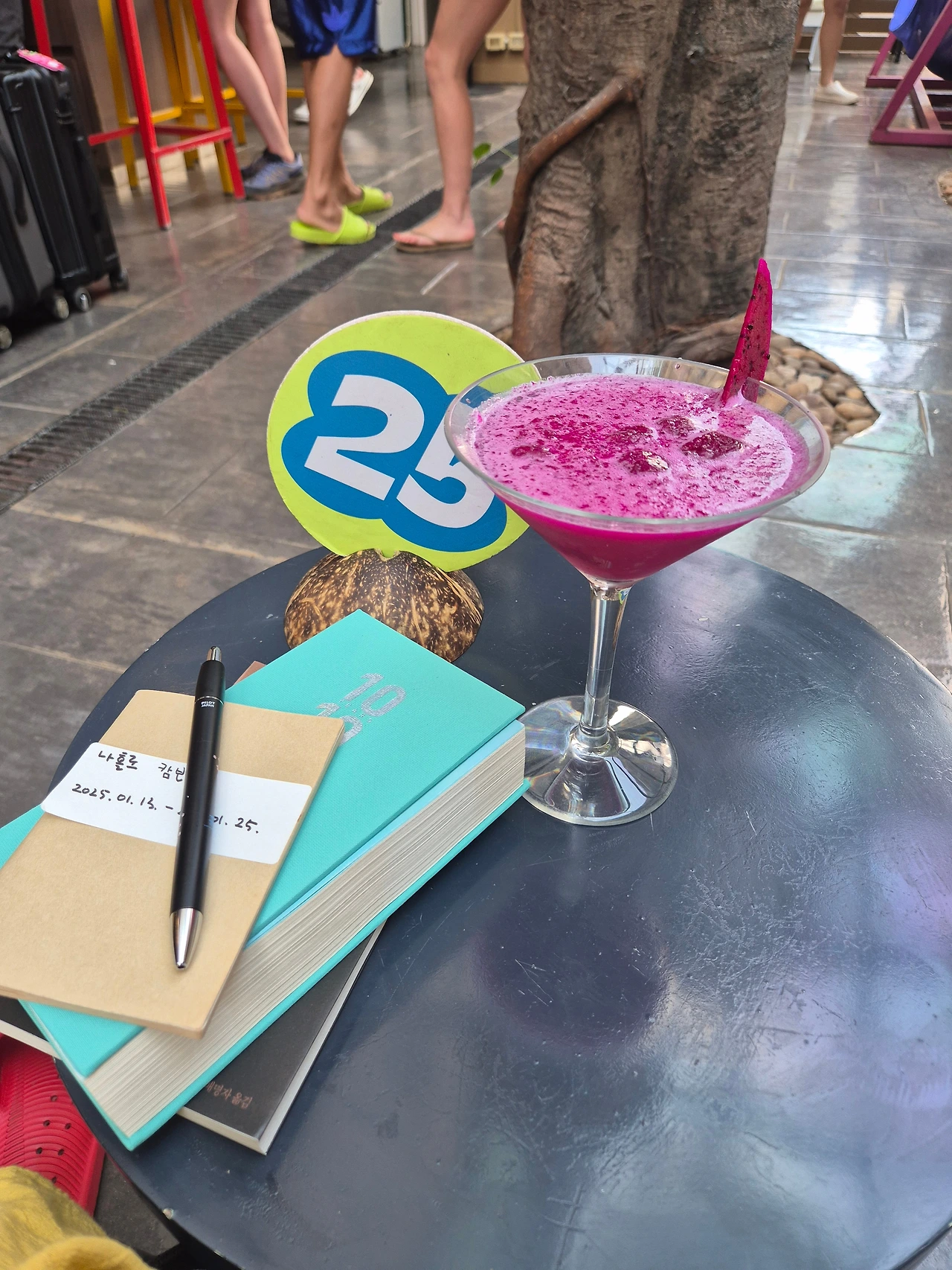 숙소에는 술과 음식이 제공되는 bar도 함께 운영 중이어서 아침식사로 뮤즐리와 아이스 아메리카노를 시켜 로비의 베드에 자리를 잡았다. 내 옆자리에는 서양의 남녀가 자유롭게 책을 읽고 있었다. 베드에 누워 메모도 하고, 책도 읽고, 핸드폰을 하며 오전 시간을 보냈다. 물론 칵테일과 맥주를 마시는 것도 잊지 않았다.