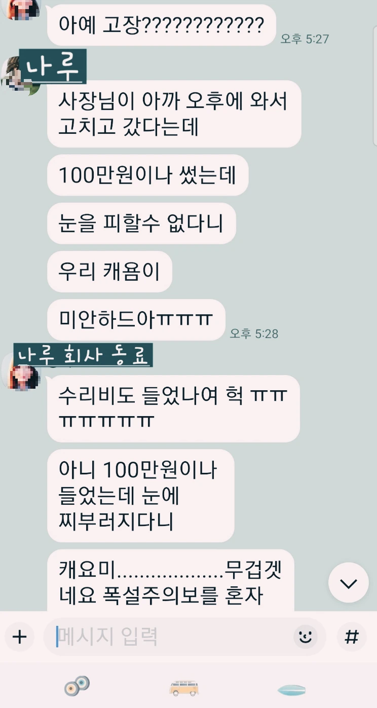 첫눈이 오늘처럼 이렇게 함박눈으로 많이 온 적이 있었나? 폭설에 가까운 첫눈이 오자 오픈채팅 대화방에 온통 나루와 나루의 반려카 캐욤, 그리고 어닝에 대한 대화가 끊이질 않는다.