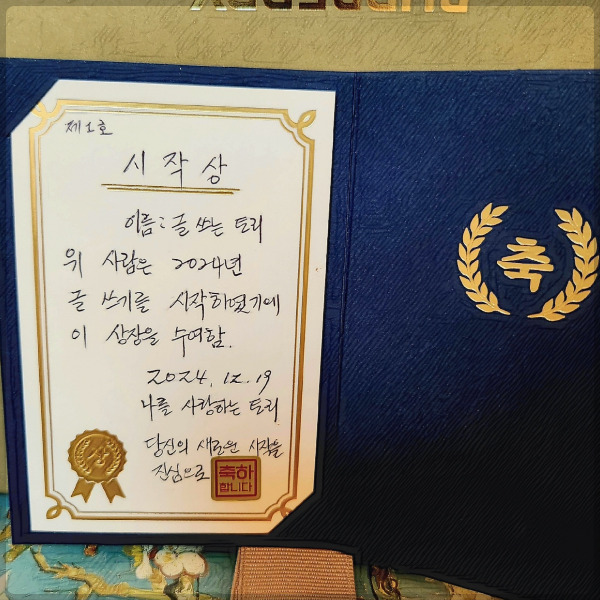 나의 전부인 나를 내가 가장 많이 아끼고 사랑해주어야 한다. 그래서 너무나도 어색하고 퍽이나 오글거리지만 내가 나에게 눈에 보이는 칭찬을 해보기로 한다. 최근에 한 일 중에 칭찬할 거리를 찾고, 그것을 눈에 보이는 “상장”에 적었다.