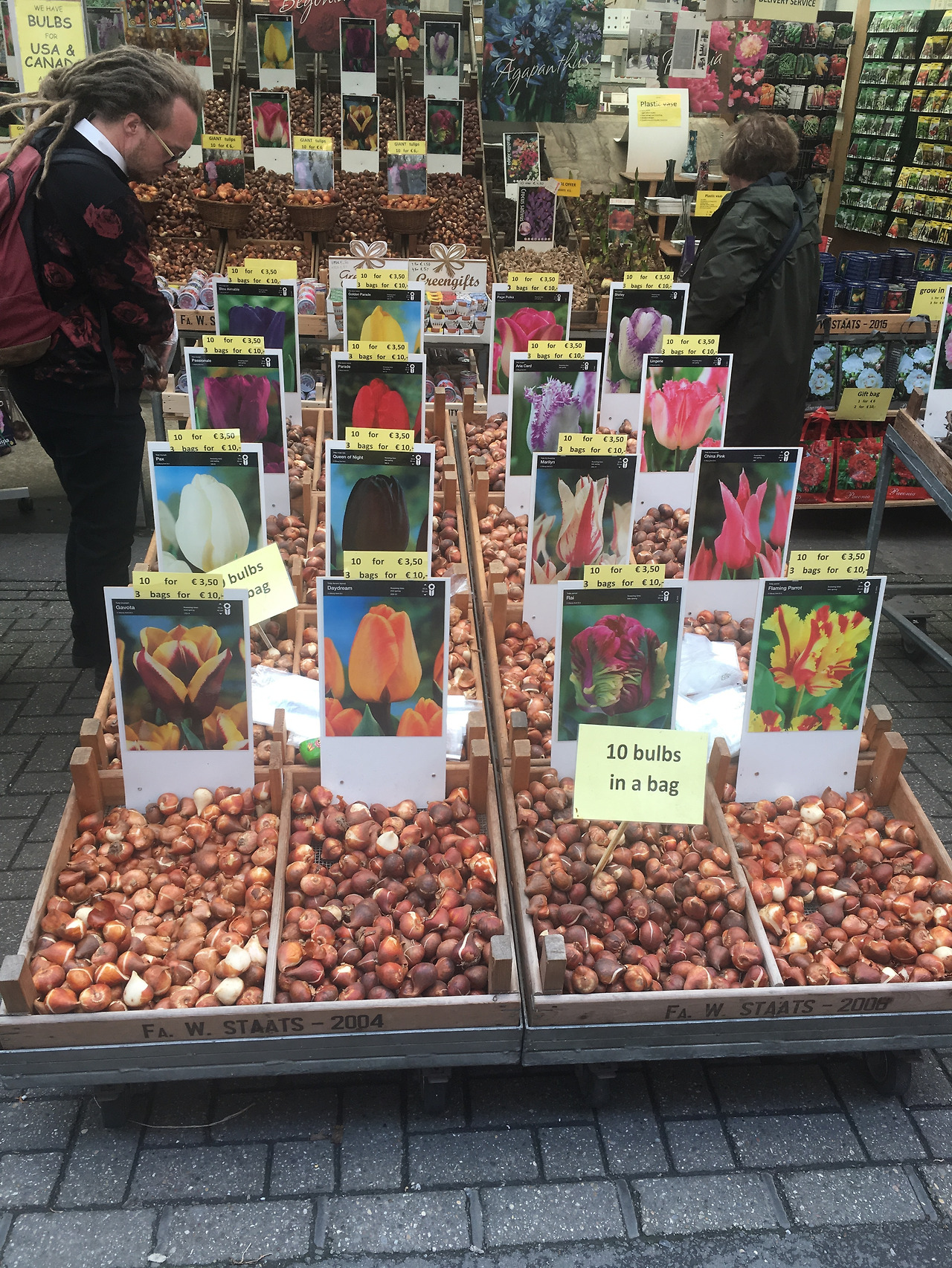 시간이 생겨 암스테르담 역 근처 큰 대로변 한 가운데에 있는 노천레스토랑에서 맥주 한 잔을 여유있게 하고, 튤립씨앗과 튤립들을 파는 시장도 구경하고, 암스테르담을 상징하는 운하 옆 좁고 높은 주택 조각도 사는 등 정시출발이었으면 못한 것들을 해서 즐거웠다.