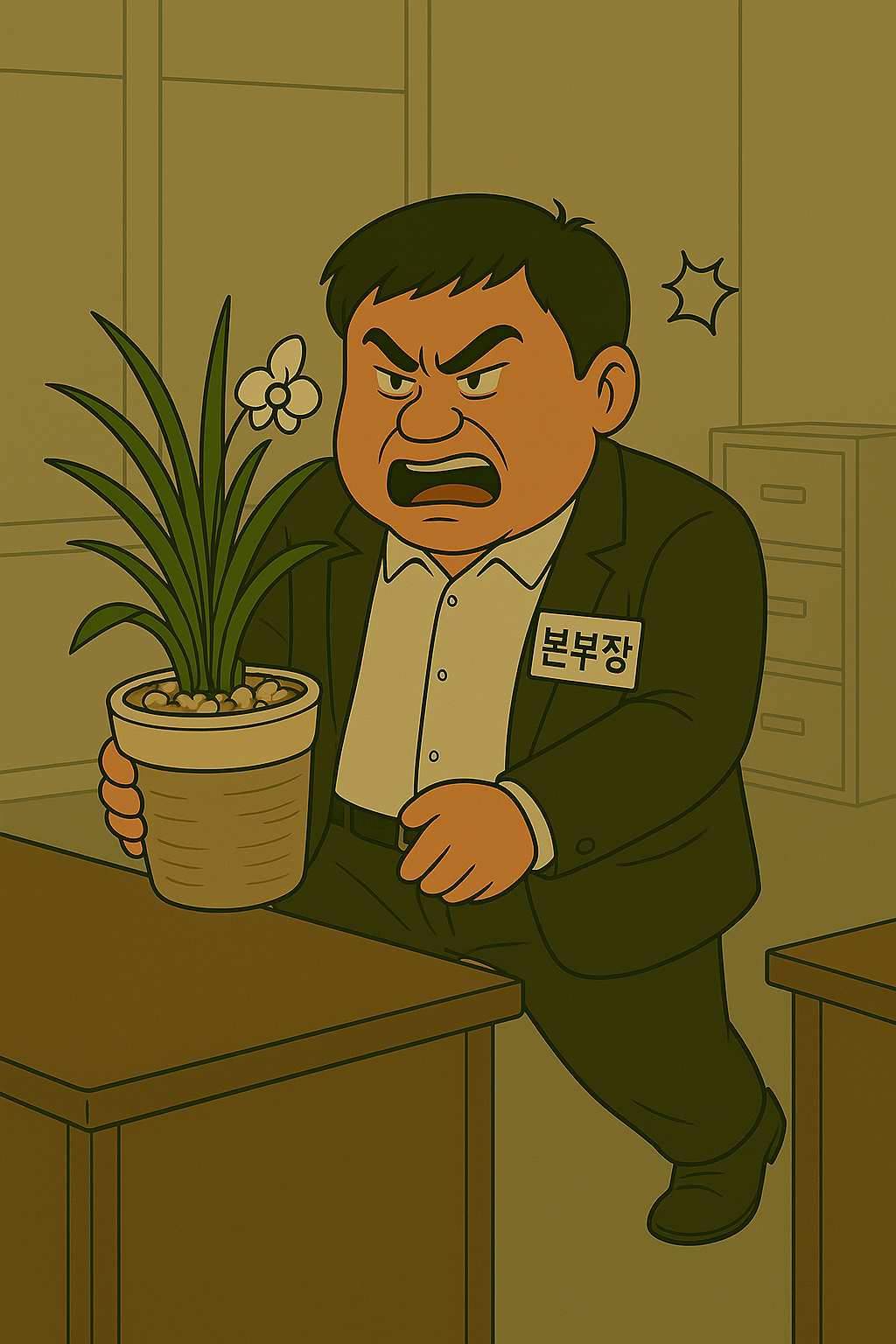 만석이 앉는 자리에 난초화분이 있는 걸 본 만석은 난초가 눈에 거슬렸는지