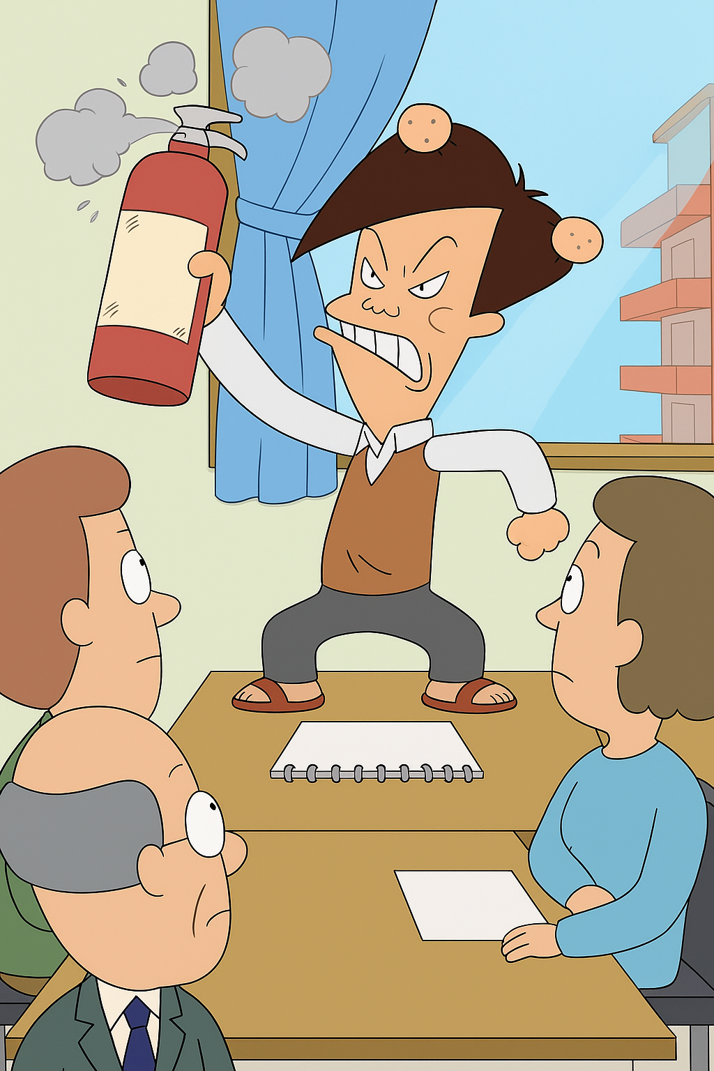 이를 본 '고길동'은 각 공종별 간부급 직원이 말할 차례가 왔을 때, 해당 공종 진행에 대한 간섭우려 등 기술적사항에 대한 얘기 보단 주 공종에 창피함을 줄 수 있는 소화기 청결상태를 지적하였습니다.