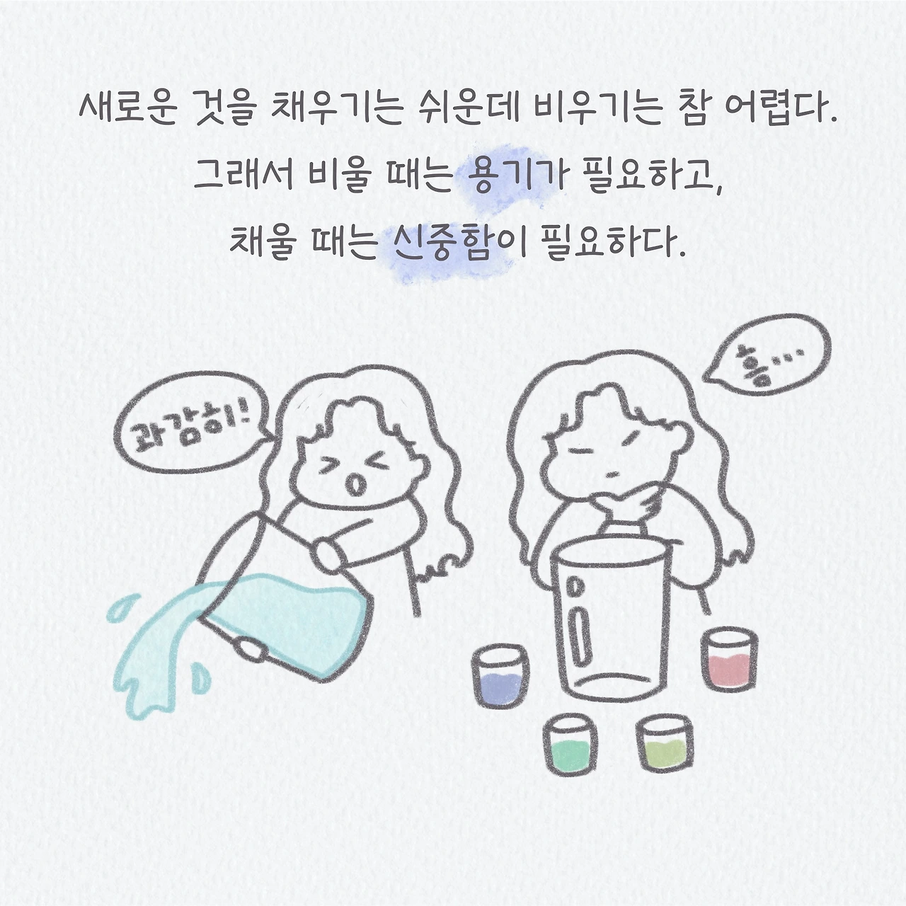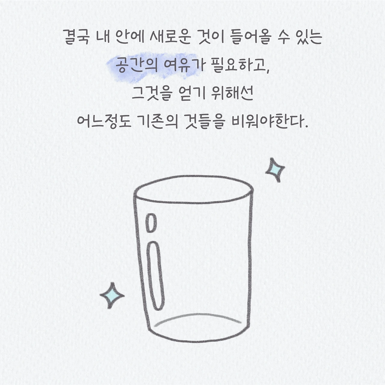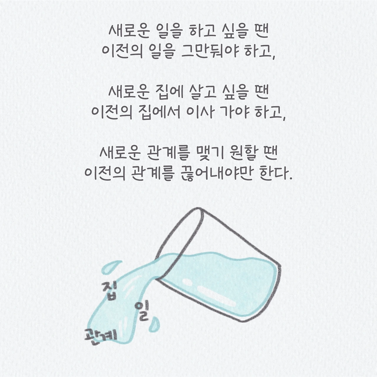 최근 정들었던 집에서 이사를 가고, 익숙했던 일에서 벗어나 새로운 일을 시작하고, 기존의 관계들을 끊어내고 새로운 관계를 맺어가고 있다. 새로운 것을 받아들이는 건 참 쉽게 이루어지는데, 편안하고 익숙하고 정들었던 것들과의 이별은 참 어렵고 힘들다. 하지만 내 안에 있던 것들을 비워서 여유의 공간을 만들어지만 새롭게 들어올 수 있는 것들이 있다. 내가 안주하지 않고 변화하기를 결정한 이상 받아들여야 하는 과정이며, 이를 통해 지금은 힘들지라도 앞으로 나에게 더욱 필요하고 나를 행복하게 해줄 것들을 얻게 될 것이라고 생각한다.