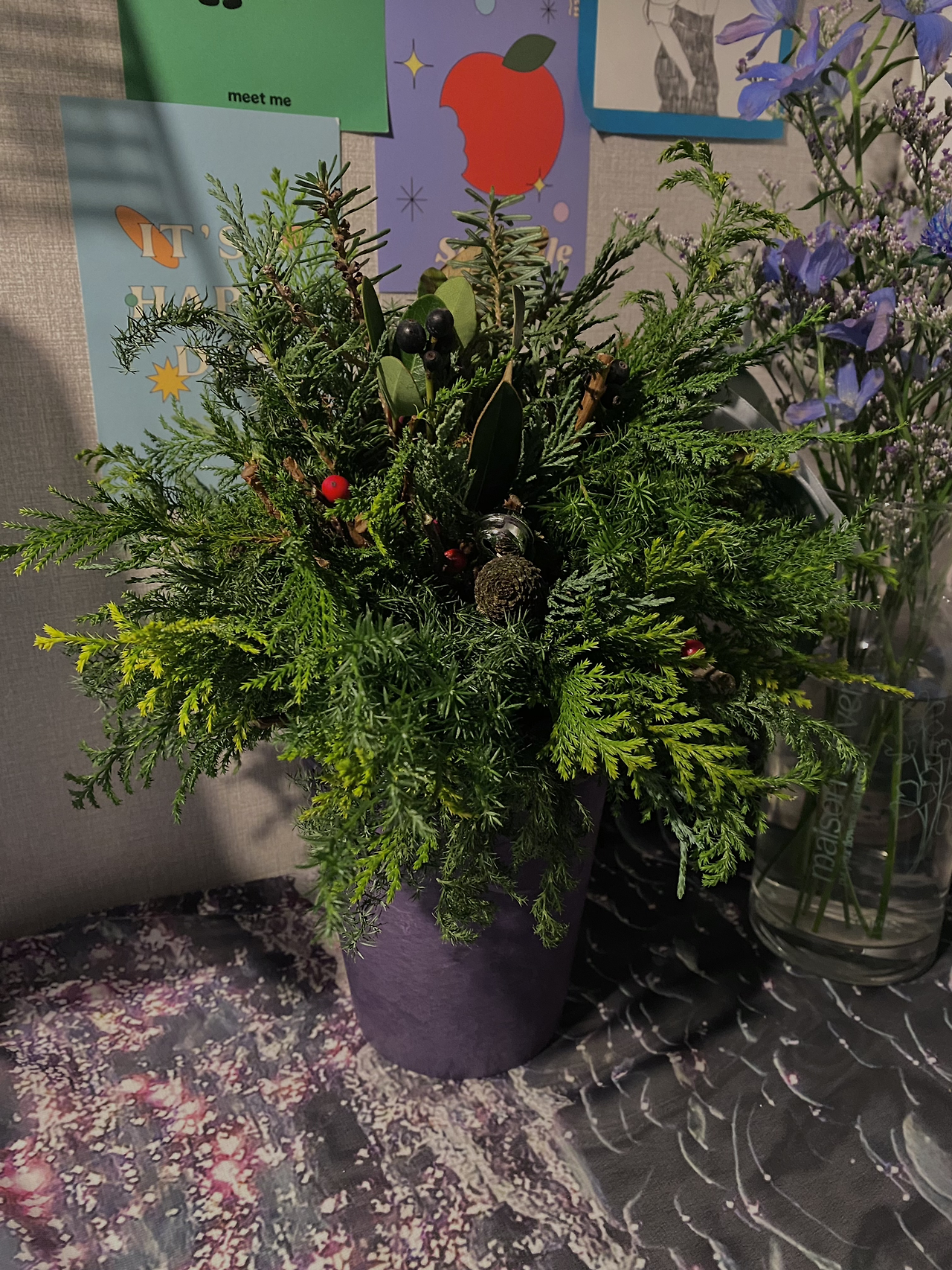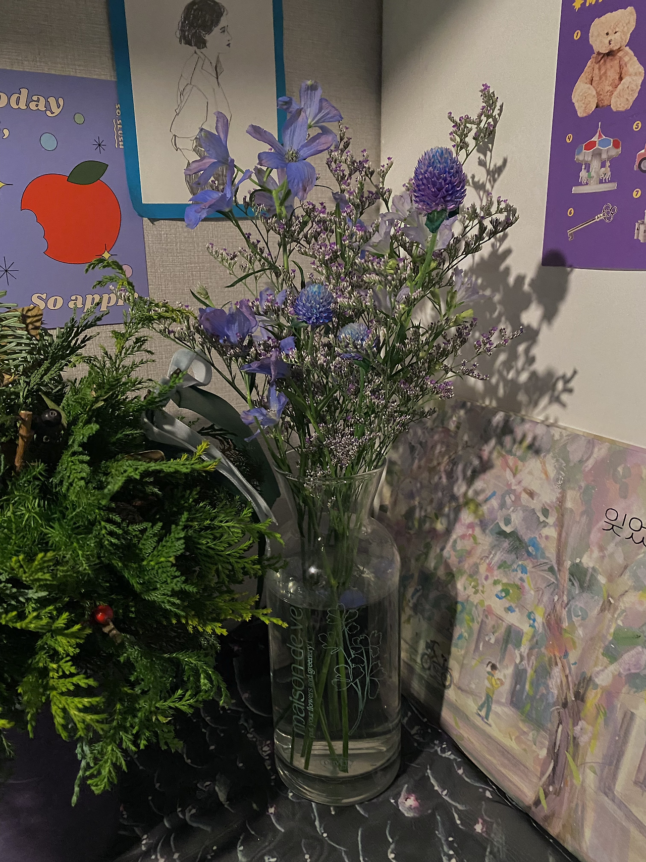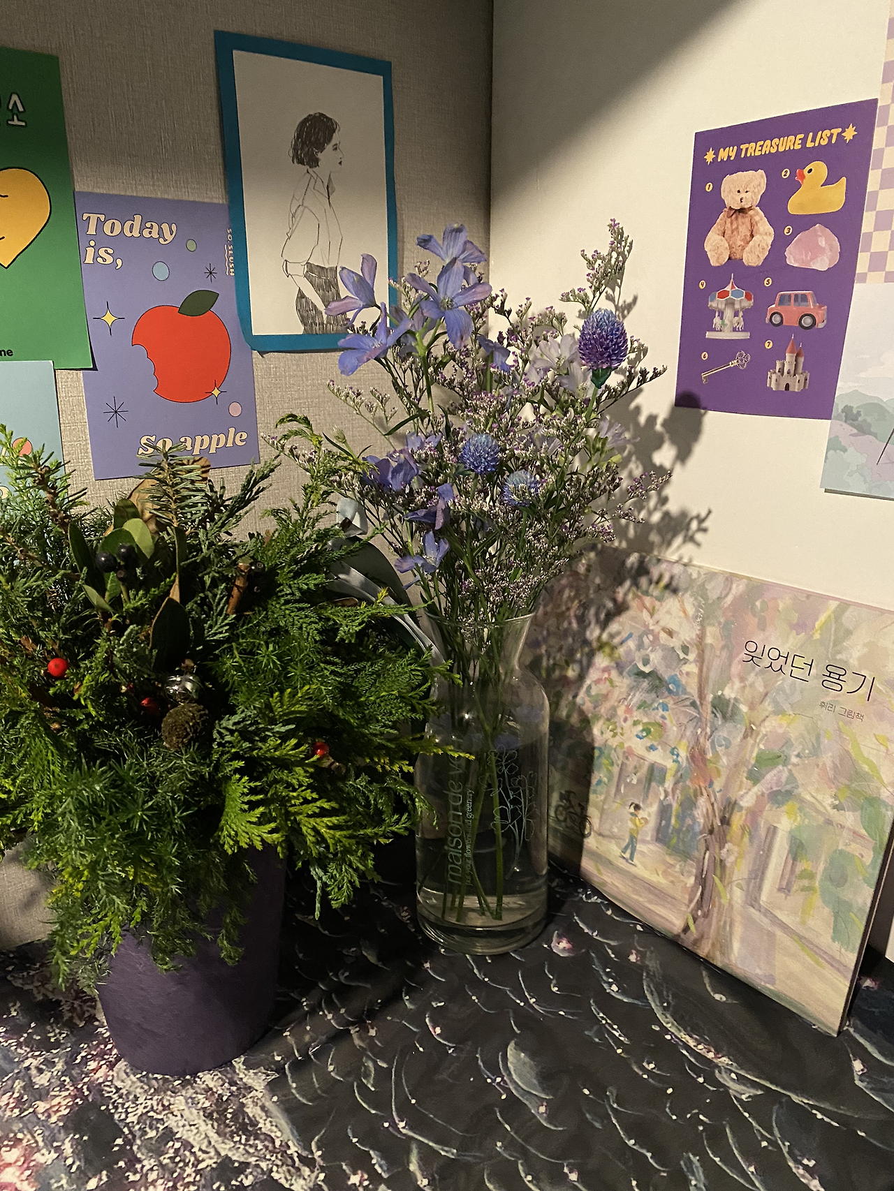 꽃의 색깔을 더 잘 보기 위해 여백이 많은 벽쪽으로 옮기고, 미니 트리에 보라색 화분을 입혀보기도 하고, 하얀 책상 위에 바다 풍경의 패브릭 커튼을 깔아보기도 하면서 아주 작고 사적인 공간에 매일 조금씩 변화를 준다. 내가 통제할 수 있는 것들이 많지 않은 하루의 시간 속에 오로지 내가 주도적으로 변화시켜 만족하는 순간이다. 또한 스스로 찾지 않고서야 발견할 수 없는 매일의 아름다움을 발굴하는 일이다. 공간을 아름답게 가꿀수록 내 삶에도 아름다운 변화가 일어난다고 믿는다. 그러니 더욱 사적이고 아름다운 것을 욕망하고 그것을 관찰하며 그만이 주는 기쁨으로 매일을 살아가고 싶다.