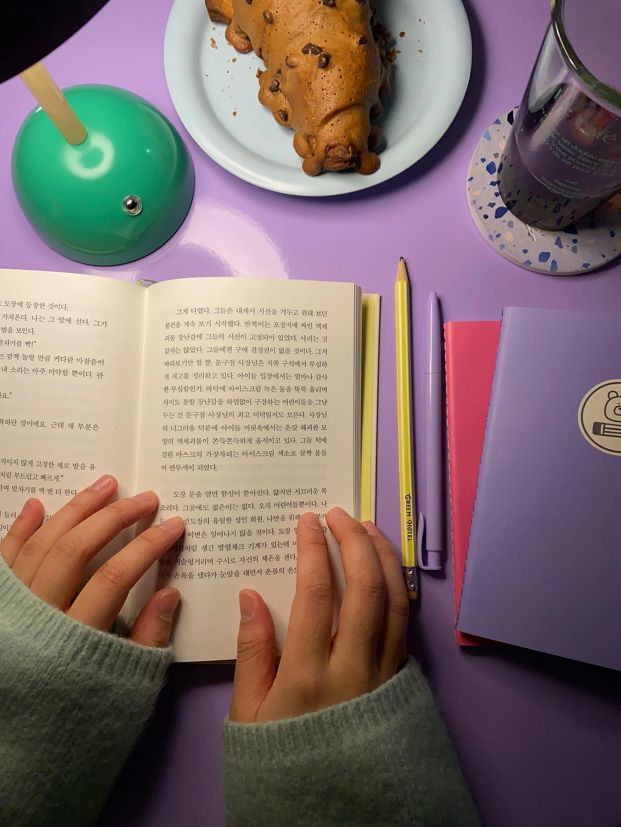 보라색 테이블 위에서의 사색