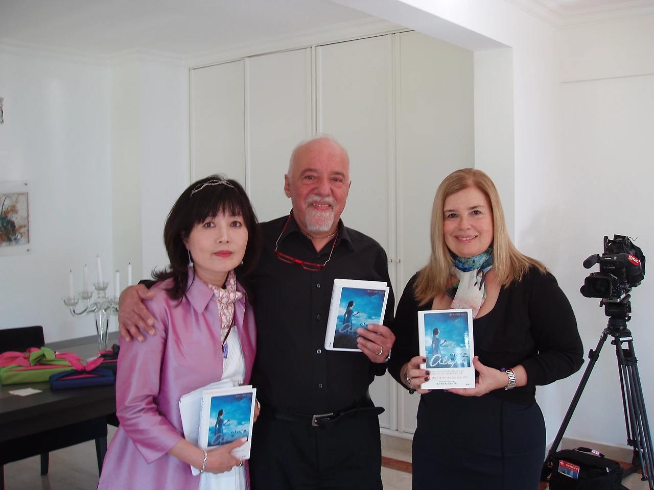 방송 인터뷰에 앞서 출간된 책을 들고 있는 <연금술사>, <알레프>의 저자 파울로 코엘료 부부와 함께.