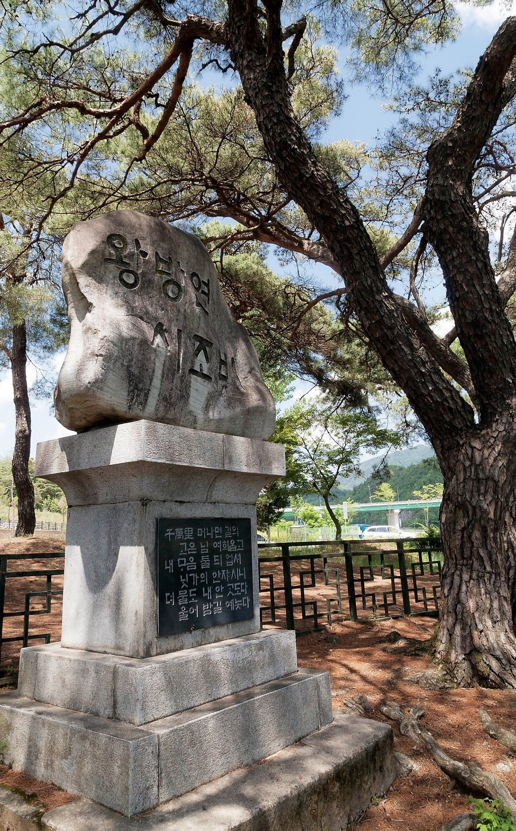 청령포 건너 강가 소나무 아래 서있는 왕방연 시조비