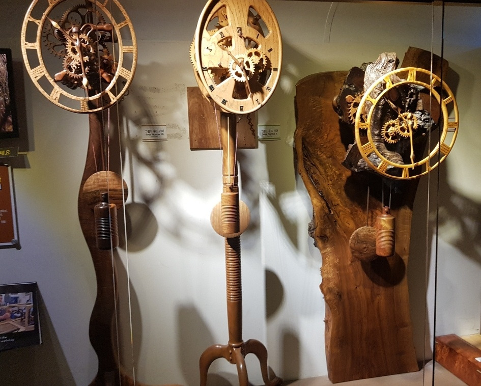 나무로만 조각한 작품들이다. 시계를 만들기보다 시간을 알려주는 조각품을 만든 수려한 조형물이다.