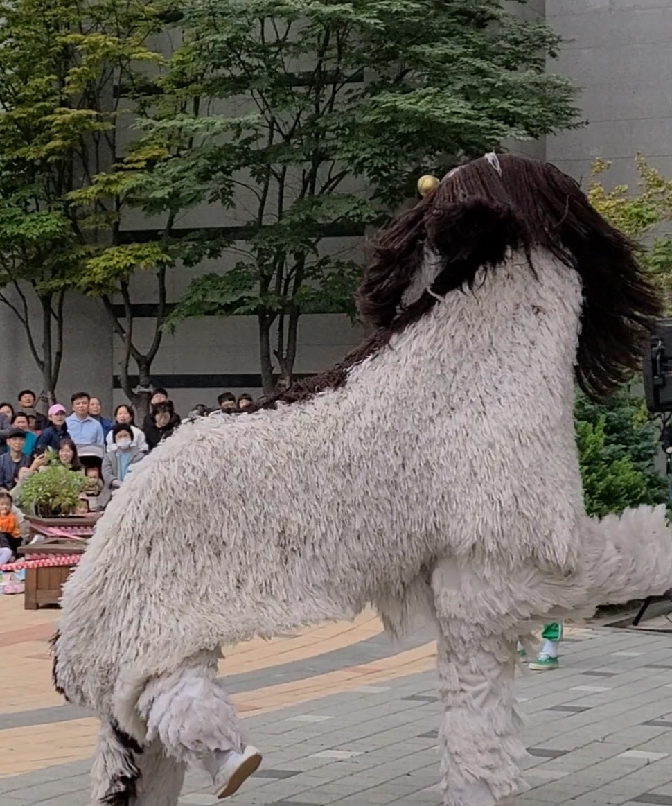 지난해 공연장에서 보았던 것과는 다른 느낌이다. 비슷한 사자탈이었는데 이 탈은 수제비를 턱 턱 떼놓고 국수를 줄 세운 듯한 모습이다. 선명하지만 명확지 않은 이목구비가 웃음을 자아낸다