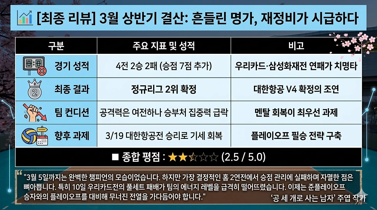 "3월 5일까지는 완벽한 챔피언의 모습이었습니다. 하지만 가장 결정적인 홈 2연전에서 승점 관리에 실패하며 자멸한 점은 뼈아픕니다. 특히 10일 우리카드전의 풀세트 패배가 팀의 에너지 레벨을 급격히 떨어뜨렸습니다. 이제는 준플레이오프 승자와의 플레이오프를 대비해 무너진 전열을 가다듬어야 합니다."