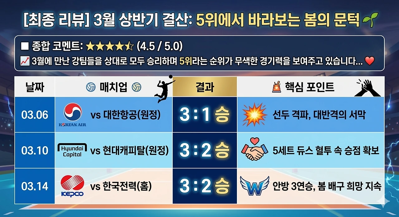의미: 3월 전승 행진을 기록하며, 최종전 결과에 따라 기적적인 봄 배구 진출을 노릴 수 있게 되었습니다.