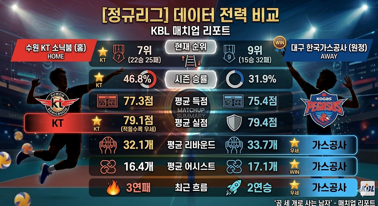 7위 KT는 최근 힉스의 이탈이라는 대형 악재 속에 '폭발하는 창'의 위력이 반감되었지만, 안방에서 연패를 끊어내야 한다는 절박함으로 무장했습니다.
